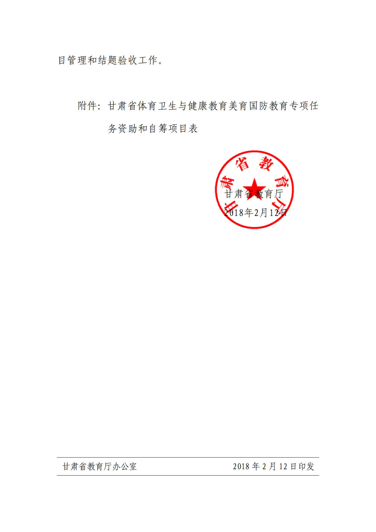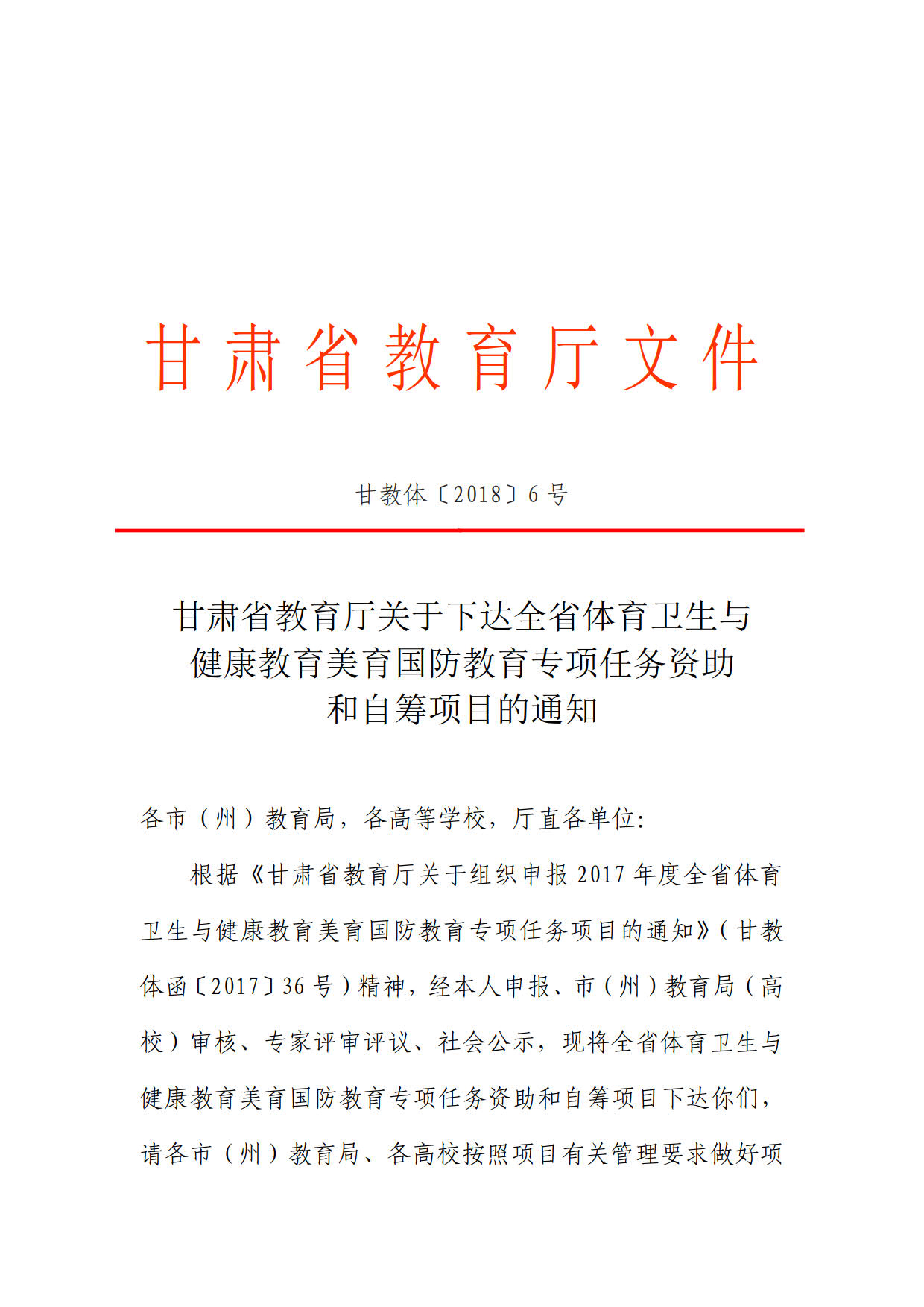 轉(zhuǎn)發(fā)甘肅省教育廳關(guān)于下達(dá)全省體育衛(wèi)生與健康教育美育國防教育專項(xiàng)任務(wù)資助和自籌項(xiàng)目的通知