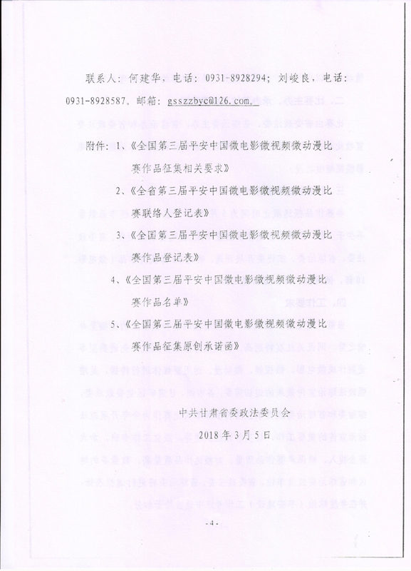現(xiàn)將甘肅省教育廳關(guān)于轉(zhuǎn)發(fā)《省委政法委<關(guān)于組織參加全國第三屆平安中國微電影微視頻微動(dòng)漫比賽的通知>》(甘政法明電〔2018〕12號(hào))轉(zhuǎn)發(fā)你們,請各部門、單位根據(jù)要求廣泛動(dòng)員,積極參與。將參賽作品存儲(chǔ)在移動(dòng)硬盤或數(shù)碼U盤中,于5月10日前報(bào)宣傳統(tǒng)戰(zhàn)部辦公室,宣傳統(tǒng)戰(zhàn)部對報(bào)送作品匯總后統(tǒng)一報(bào)送省教育廳。