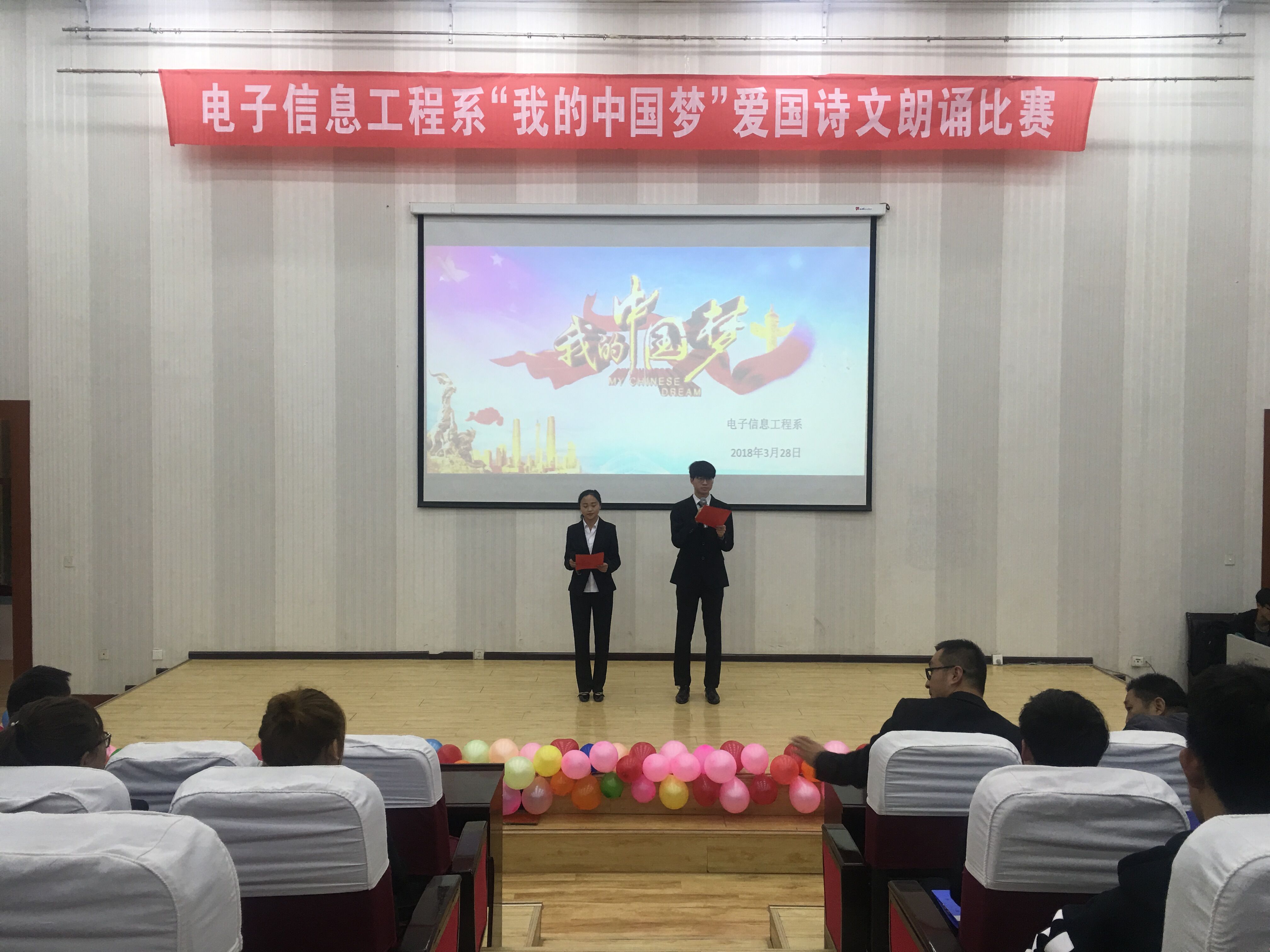 ? ? 為進(jìn)一步弘揚(yáng)和培育社會(huì)主義核心價(jià)值觀,引導(dǎo)學(xué)生實(shí)現(xiàn)國家富強(qiáng)、民族復(fù)興的偉大“中國夢”而發(fā)憤圖強(qiáng)、勇?lián)厝危?/span>激勵(lì)學(xué)生通過誦讀經(jīng)典來繼承傳統(tǒng),增強(qiáng)學(xué)生的愛國情感。3月28日,電子信息工程系在正德廳舉辦了“我的中國夢”愛國詩文朗誦比賽。電子信息工程系黨總支書記袁青年、系主任李亞梅、全體班主任及學(xué)生觀看了比賽。
