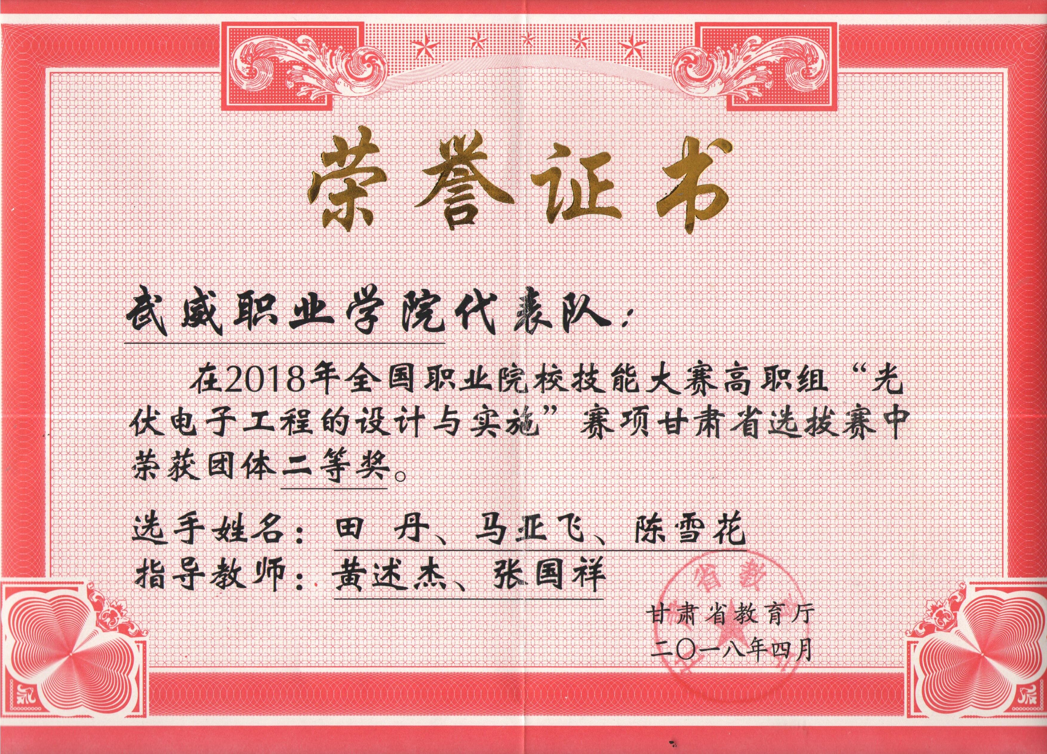 4月14日,2018年全國職業(yè)院校技能大賽“光伏電子工程的設計與實施”賽項甘肅省選拔賽在甘肅林業(yè)職業(yè)技術學院舉行。此次大賽有蘭州石化職業(yè)技術學院、甘肅林業(yè)職業(yè)技術學院、武威職業(yè)學院等6所院校的11支代表隊33名選手參加。由我院能源工程系黃述杰、張國祥老師指導,田丹、馬亞飛、陳雪花三名學生組成的武威職業(yè)學院一隊榮獲二等獎。