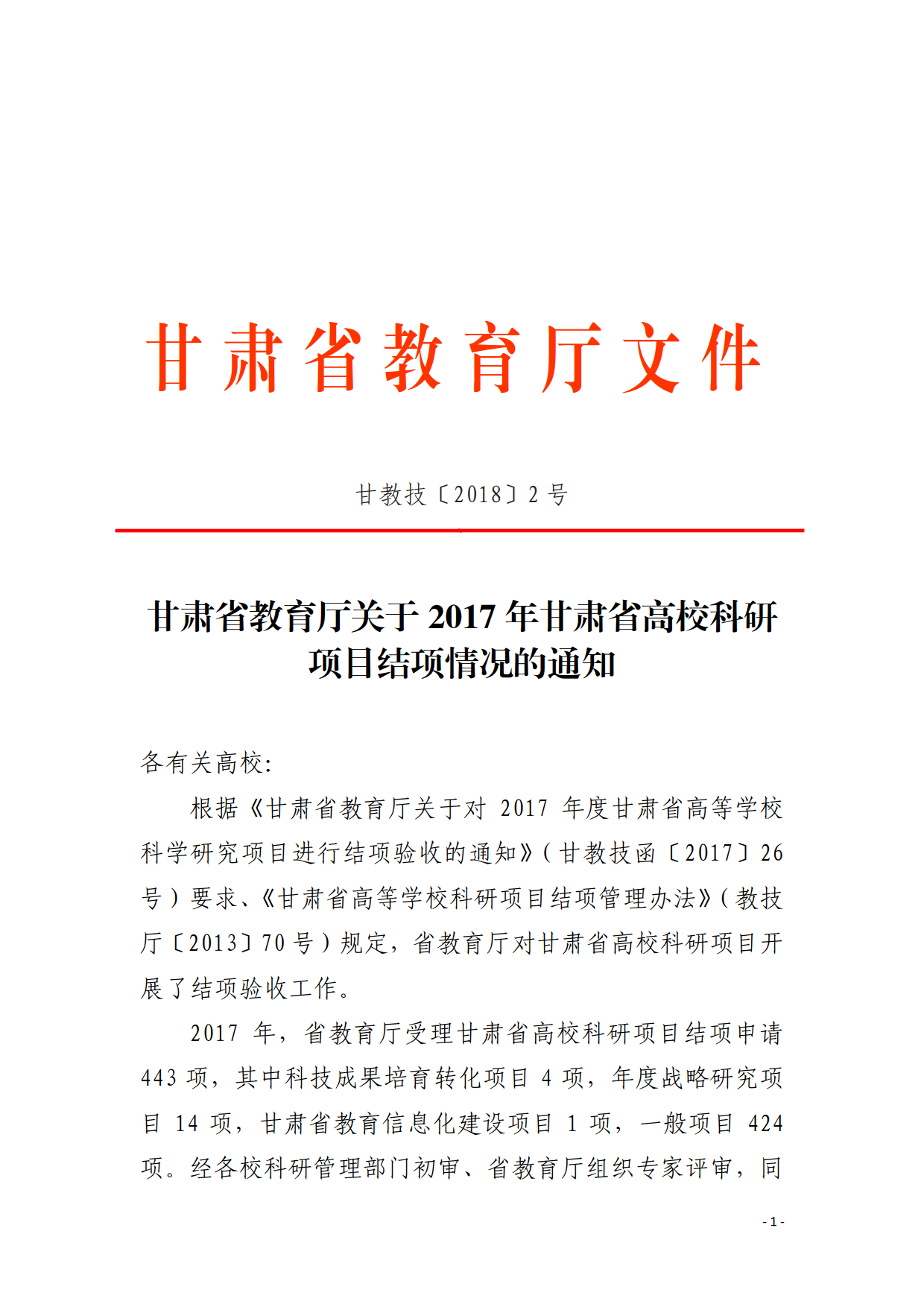 甘肅省教育廳關(guān)于2017年甘肅省高??蒲许椖拷Y(jié)項情況的通知