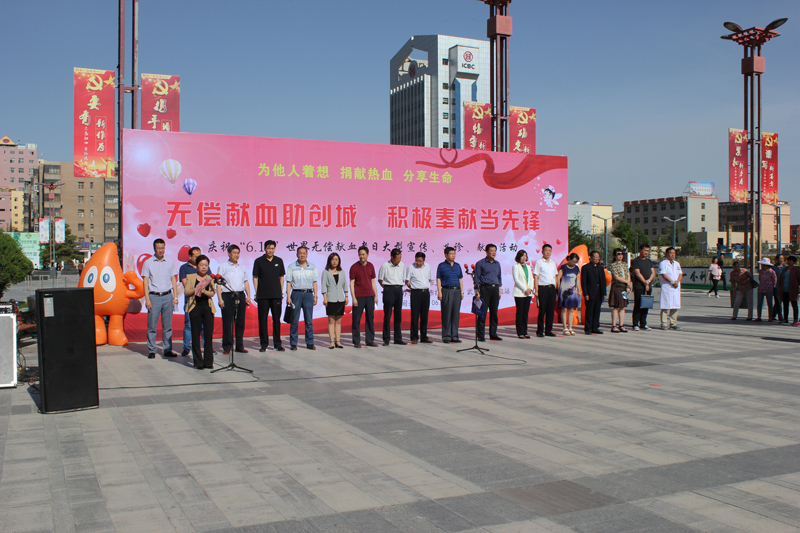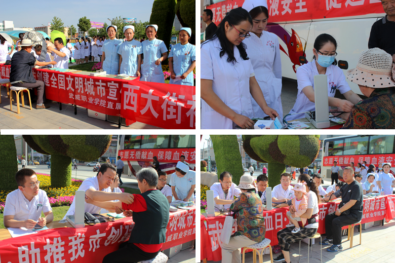 為保障臨床用血安全,給我市創(chuàng)建全國文明城市活動增亮添彩,由武威市衛(wèi)生計生委、武威市紅十字會主辦,武威市中心血站承辦的“世界無償獻血者日”大型宣傳、義診、獻血活動于6月14日在武威市文化廣場隆重舉行。學(xué)院附屬醫(yī)院醫(yī)護人員、學(xué)院紅十字志愿者方隊、無償獻血獲獎?wù)叻疥牭?0余家單位的干部群眾參加了活動。