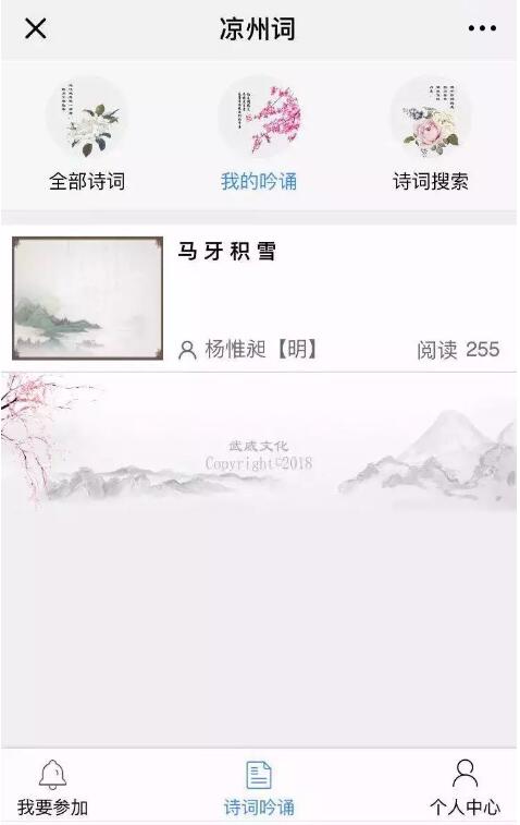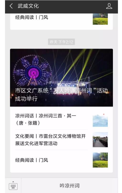 1.打開“武威文化”公眾號,點擊最下方“吟涼州詞”進入活動“萬人吟誦涼州詞”活動頁面。