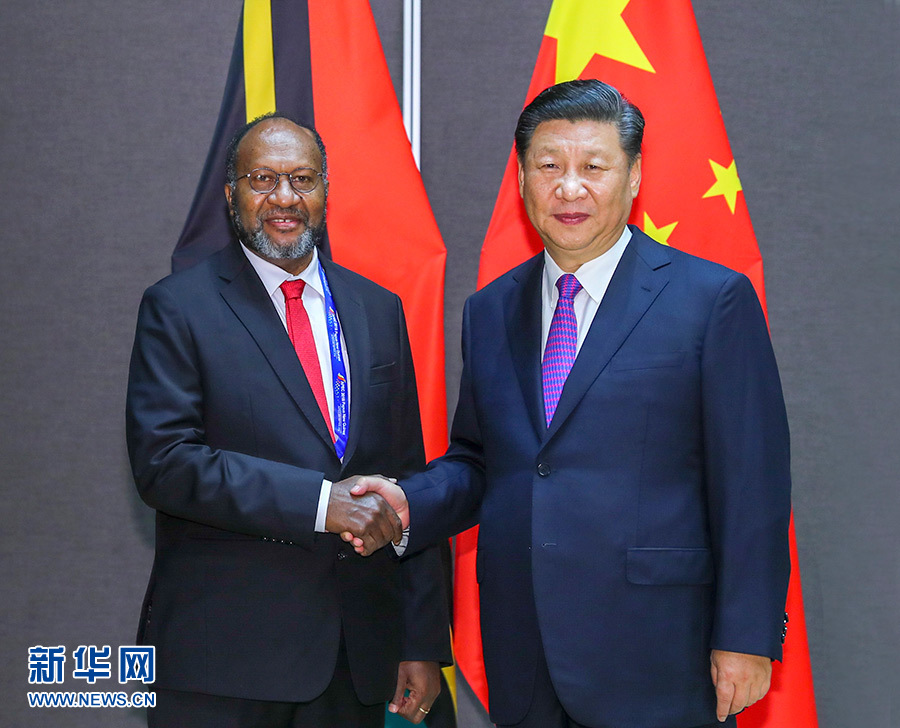 11月16日,國家主席習(xí)近平在莫爾茲比港分別會見建交太平洋島國領(lǐng)導(dǎo)人。這是習(xí)近平會見紐??偫硭?。 新華社記者 丁林 攝