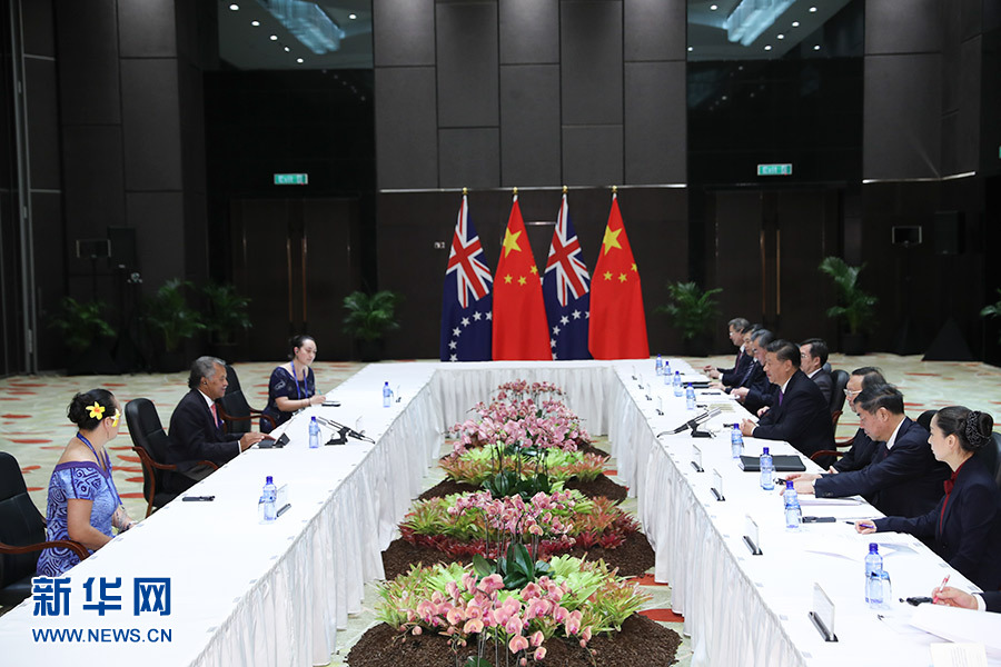 11月16日,國家主席習(xí)近平在莫爾茲比港分別會見建交太平洋島國領(lǐng)導(dǎo)人。這是習(xí)近平會見庫克群島總理普納。 新華社記者 丁林 攝