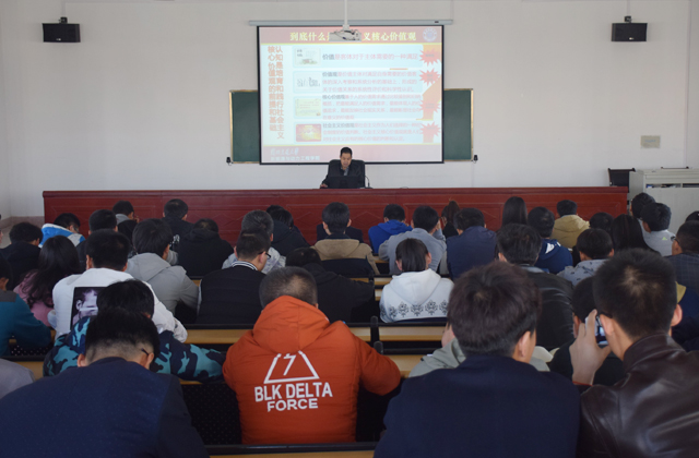 翟存祥從社會(huì)主義核心價(jià)值觀的時(shí)代背景、社會(huì)主義核心價(jià)值觀的頂層設(shè)計(jì)、核心價(jià)值觀與核心價(jià)值體系的關(guān)系、社會(huì)主義核心價(jià)值觀的系統(tǒng)培育、社會(huì)主義核心價(jià)值觀的全面踐行等五個(gè)方面,分析了中國(guó)共產(chǎn)黨價(jià)值取向的發(fā)展歷程、培育和踐行社會(huì)主義核心價(jià)值觀的重要性和迫切性,培育和踐行社會(huì)主義核心價(jià)值觀對(duì)實(shí)現(xiàn)中國(guó)夢(mèng)的重要現(xiàn)實(shí)意義和深遠(yuǎn)歷史意義,以及培育和踐行社會(huì)主義核心價(jià)值觀的措施等問題,并對(duì)為什么要培育和踐行、怎么培育和踐行作了系統(tǒng)和精彩的解讀。翟存祥指出,十八大報(bào)告將社會(huì)主義核心價(jià)值觀凝練為24個(gè)字:“富強(qiáng)、民主、文明、和諧;自由、平等、公正、法治;愛國(guó)、敬業(yè)、誠(chéng)信、友善”,從國(guó)家、社會(huì)、個(gè)人三個(gè)層面,簡(jiǎn)單扼要、簡(jiǎn)約樸實(shí)、簡(jiǎn)潔通俗地提出了社會(huì)主義核心價(jià)值觀的新表達(dá),也為當(dāng)今中國(guó)社會(huì)的核心價(jià)值觀構(gòu)建提出了新要求。社會(huì)主義核心價(jià)值觀既有理論的延續(xù)性,又有現(xiàn)實(shí)的針對(duì)性;既有目標(biāo)追求,又有價(jià)值導(dǎo)向,還有行為準(zhǔn)則,是人心所愿、眾望所歸。翟存祥結(jié)合學(xué)院發(fā)展實(shí)際,要求學(xué)生黨員及班團(tuán)干部從現(xiàn)在做起,從自己做起,努力向上,踐行社會(huì)主義核心價(jià)值觀,追求有信念,有夢(mèng)想,有奮斗,有奉獻(xiàn)的人生,讓自己的人生更有意義。