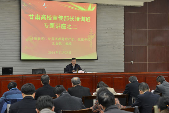 王嘉毅在專題講座中介紹了甘肅高等教育現(xiàn)狀、存在問題和“十三五”發(fā)展目標(biāo)。他指出,高校宣傳思想工作主要任務(wù)要把學(xué)習(xí)貫徹落實黨的十八大以來的重大部署,特別是六中全會精神和習(xí)近平總書記系列重要講話精神作為重要任務(wù)來抓;要把貫徹落實中宣部、教育部黨組《關(guān)于加強和改進高校宣傳思想工作隊伍建設(shè)的意見》精神和省委辦公廳、省政府辦公廳《關(guān)于進一步加強和改進新形勢下高校宣傳思想工作的實施意見》作為重要任務(wù)來抓;要把進一步弘揚社會主義核心價值觀、加強正面宣傳、傳播正能量作為重要任務(wù)來抓。通過準(zhǔn)確把握新形勢下高校宣傳思想工作的動態(tài),分析研判我省高校宣傳思想工作面臨的問題,切實加強高校意識形態(tài)領(lǐng)域的工作,提升網(wǎng)絡(luò)輿情掌控應(yīng)對能力,積極開展馬克思主義研究,全面繁榮哲學(xué)社會科學(xué),提高覺悟,凝聚共識,強化措施,全面推動高校宣傳思想工作質(zhì)量提升和創(chuàng)新發(fā)展。
