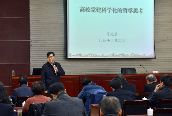 陳克恭在題為《高校黨建科學(xué)化的哲學(xué)思考》的講座中,以其獨特視角通過回顧中國近代史,闡明了中國共產(chǎn)黨執(zhí)政的客觀實在性。他認(rèn)為,要用中國智慧、中國思維把馬克思主義和西方科學(xué)有機統(tǒng)一起來,構(gòu)建具有中國特色、中國風(fēng)格、中國氣派的哲學(xué)社會科學(xué)體系。并以西北師大為例,就大學(xué)治理體系的現(xiàn)代化提出了自己的思考。