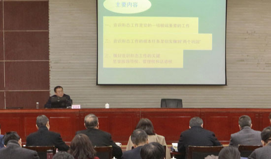 肖安鹿在題為《習(xí)近平總書記關(guān)于意識形態(tài)工作的思考》的講座中,從意識形態(tài)工作是黨的一項極端重要的工作,意識形態(tài)工作的根本任務(wù)是貫徹落實“兩個鞏固”,做好意識形態(tài)工作的主要工作是掌握領(lǐng)導(dǎo)權(quán)、管理權(quán)和話語權(quán)等三個方面,為學(xué)員們作了深入淺出地解讀。