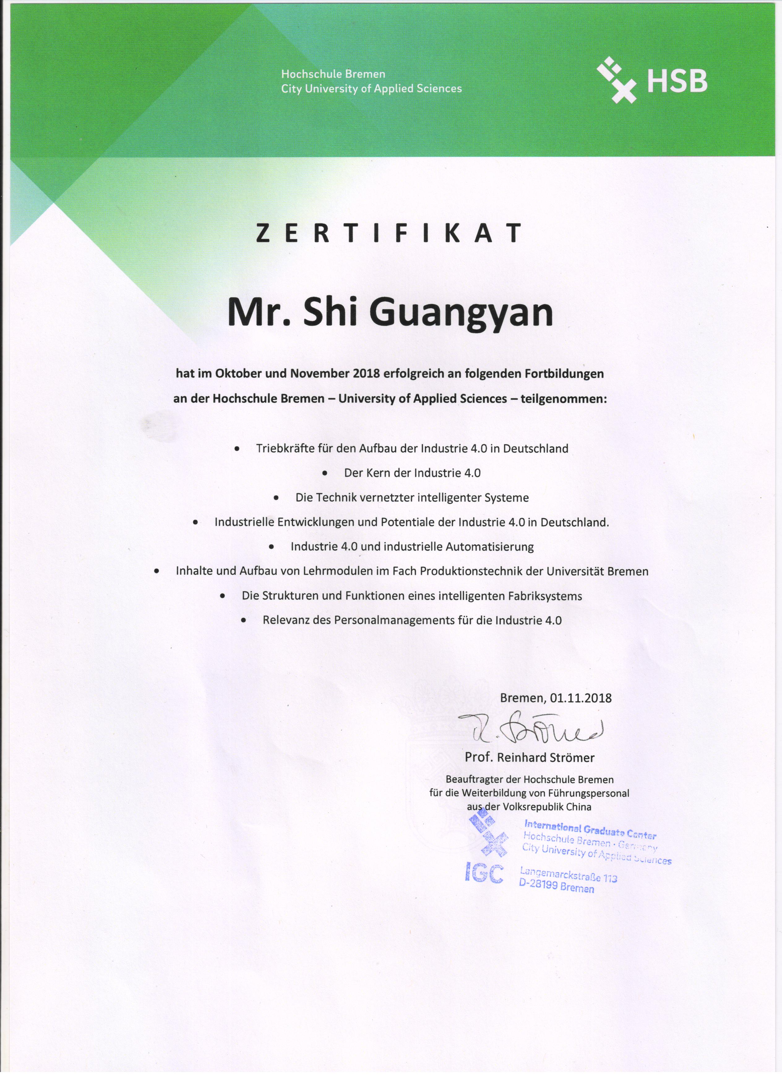 ?史光巖老師參加由甘肅省外專局組織的2018年出國(guó)(境)培訓(xùn)項(xiàng)目計(jì)劃,前往德國(guó)不萊梅應(yīng)用科技大學(xué)參加為期14天的“工業(yè)4.0工廠實(shí)驗(yàn)室建設(shè)培訓(xùn)團(tuán)”。