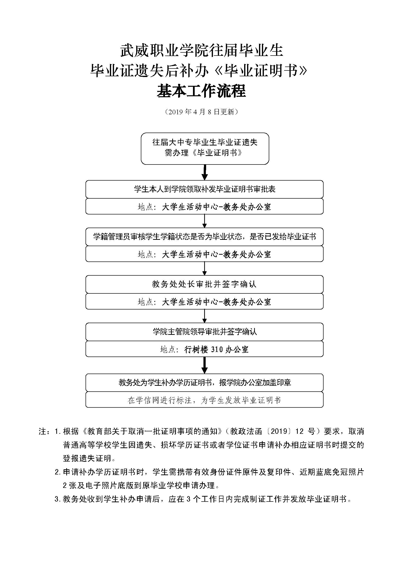 武威職業(yè)學(xué)院往屆畢業(yè)生畢業(yè)證遺失后補(bǔ)辦《畢業(yè)證明書》 基本工作流程