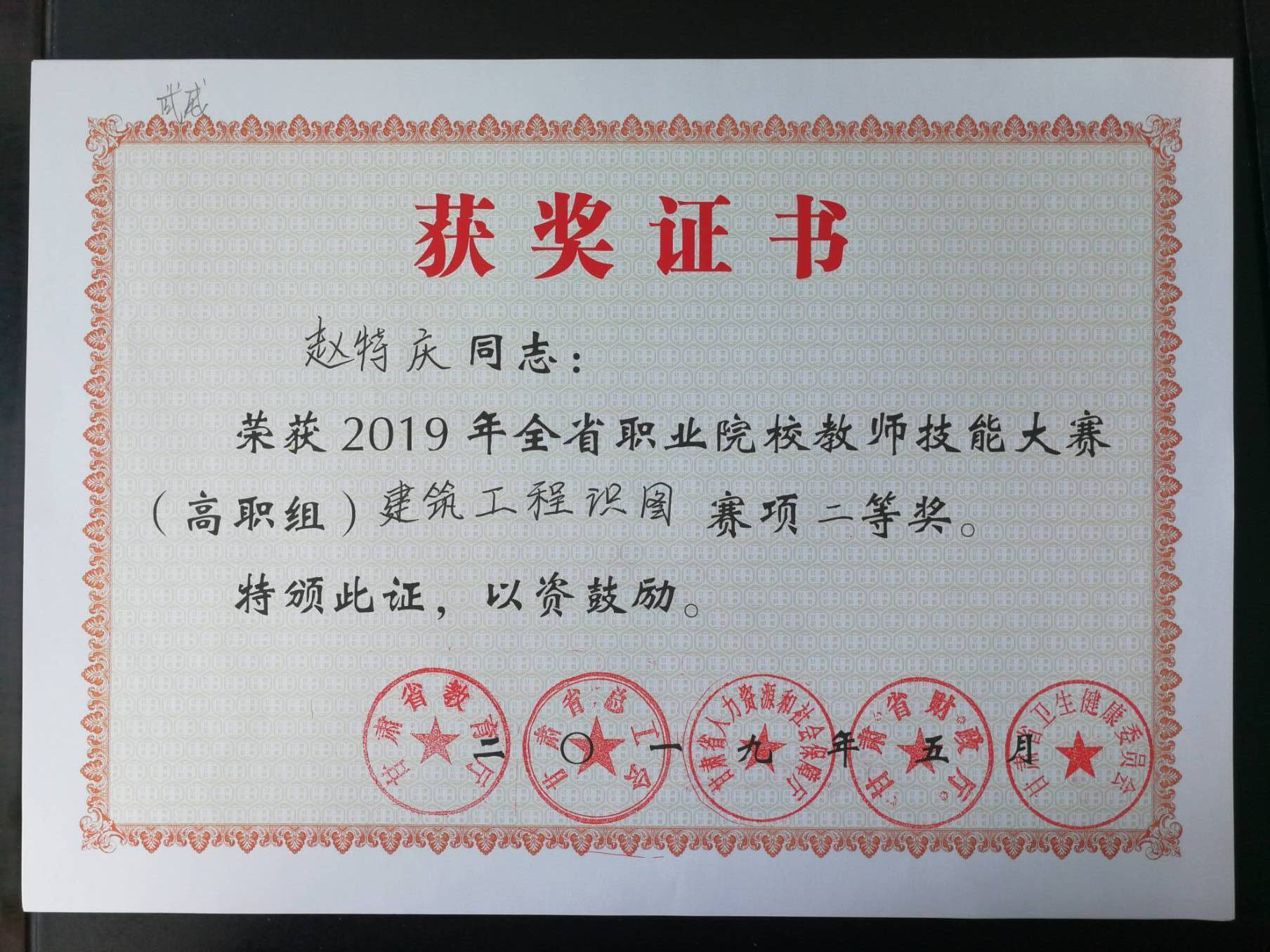 4月12 -14日,由甘肅省教育廳主辦的2019年全省職業(yè)院校教師技能大賽“建筑工程識(shí)圖”賽項(xiàng)在甘肅建筑職業(yè)技術(shù)學(xué)院舉辦。此次大賽有來(lái)自全省各地州市12所院校的21支代表隊(duì)42名選手參加。由我院建筑工程系趙特慶、王鵬老師組成的武威職業(yè)學(xué)院代表隊(duì)榮獲團(tuán)體二等獎(jiǎng)。