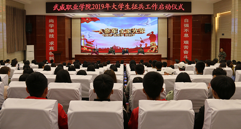 5月9日下午,學(xué)院2019年大學(xué)生征兵工作啟動(dòng)儀式在大學(xué)生活動(dòng)中心菁英廳舉行。武威軍分區(qū)司令員、市征兵領(lǐng)導(dǎo)小組副組長張國輝大校,涼州區(qū)人武部部長、涼州區(qū)征兵領(lǐng)導(dǎo)小組副組長兼征兵辦公室主任闞延貴上校,學(xué)院黨委書記、院長趙明,副院長田迎春,武威軍分區(qū)動(dòng)員處、涼州區(qū)人武部干部,學(xué)院各系黨總支書記、輔導(dǎo)員及學(xué)生代表共計(jì)220余人參加了會議。會議由田迎春主持。