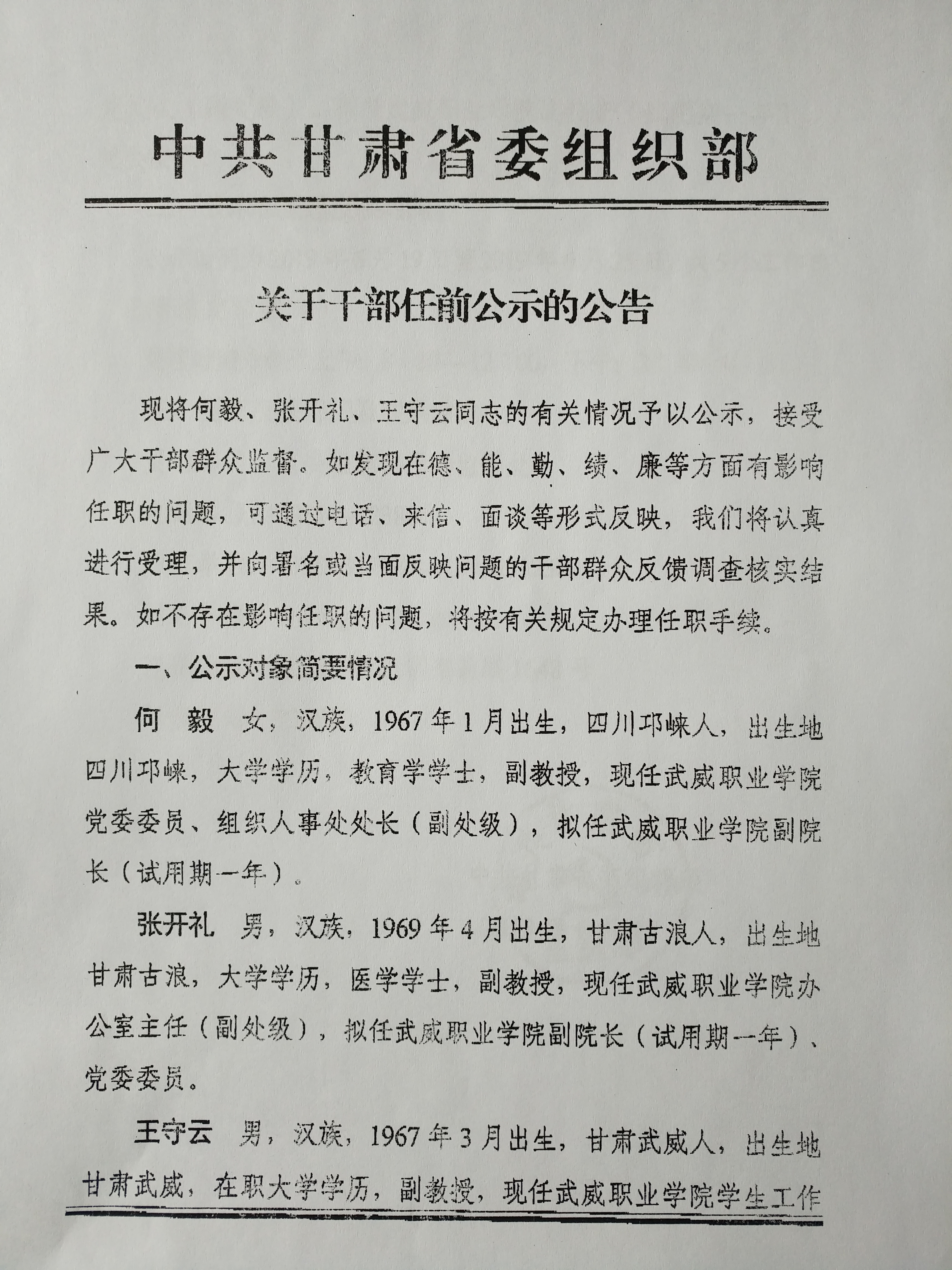 現(xiàn)將省委組織部關(guān)于何毅、張開禮、王守云同志的有關(guān)情況予以公示,接受廣大干部群眾監(jiān)督。