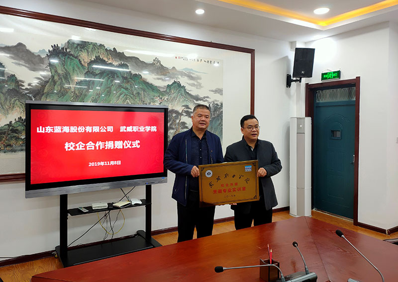 在捐贈儀式上,楊兆永總經(jīng)理介紹了山東藍海股份有限公司做了介紹,雙方在人才需求、專業(yè)課程設置開發(fā)、雙師型師資培養(yǎng)、教學組織實習質(zhì)量評估、就業(yè)服務等多方面合作近十年,已經(jīng)將校企雙方緊密聯(lián)合在一起,同時希望今后繼續(xù)不斷在師資隊伍培養(yǎng)、人才培養(yǎng)、教育教學繼續(xù)加強合作,實現(xiàn)雙贏,共同發(fā)展。