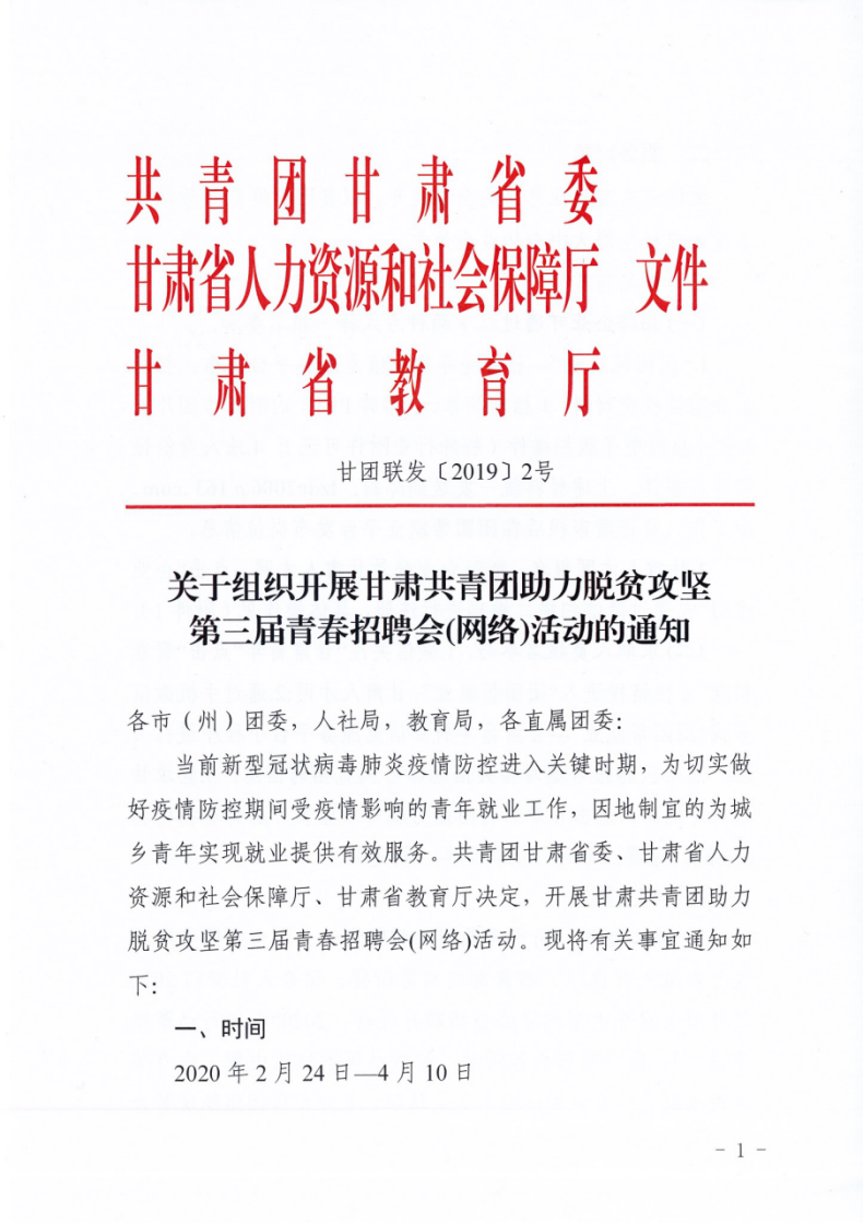關(guān)于組織開展甘肅共青團(tuán)助力脫貧攻堅第三屆青春招聘會(網(wǎng)絡(luò))活動的通知