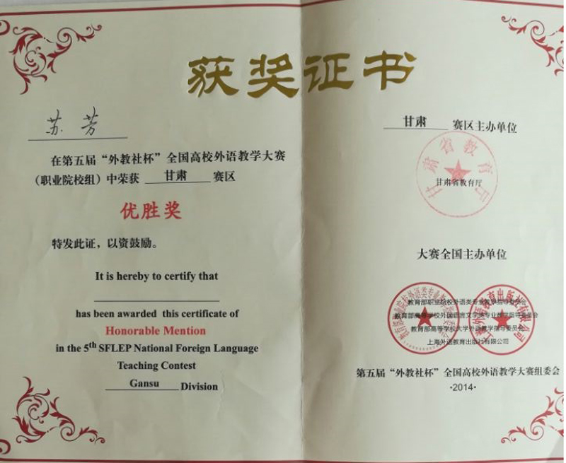 蘇芳榮獲2014年第五屆“外教社”杯全國高校外語教學(xué)大賽(職業(yè)院校組)甘肅賽區(qū)優(yōu)勝獎