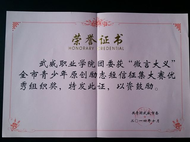 近日,由武威團(tuán)市委舉辦的武威市“微言大義”青少年原創(chuàng)勵(lì)志短信征集大賽圓滿(mǎn)結(jié)束,我院郝金秀同學(xué)榮獲一等獎(jiǎng),李志強(qiáng)、于婷等4名同學(xué)榮獲二等獎(jiǎng),尉杰靈、陳對(duì)麗等3名同學(xué)榮獲三等獎(jiǎng),羅曉飛、楊彩玲等7名同學(xué)榮獲優(yōu)秀獎(jiǎng),學(xué)院團(tuán)委榮獲優(yōu)秀組織獎(jiǎng)。
