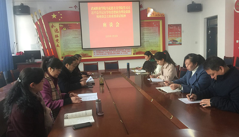 為了深入學(xué)習(xí)貫徹習(xí)近平總書記在在學(xué)校思想政治理論課教師座談會上的講話精神,3月20日下午,武威職業(yè)學(xué)院馬克思主義學(xué)院召開思政教師座談會,專題學(xué)習(xí)習(xí)近平總書記在學(xué)校思想政治理論課教師座談會上的重要講話精神,深入交流學(xué)習(xí)總書記講話精神的心得體會。會議由馬克思主義學(xué)院副院長胡靜峰主持。