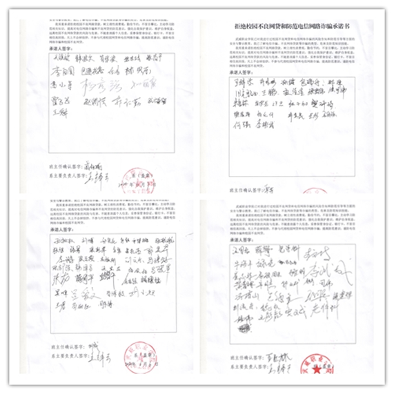 ??對學生進行校園不良網(wǎng)貸和電信網(wǎng)絡(luò)詐騙的風險告知和防范引導等方面的安全與警示教育,讓學生了解電信詐騙、不良網(wǎng)絡(luò)貸款等詐騙的類型、危害及防范知識技能。自愿簽訂拒絕不良網(wǎng)貸和防范電信網(wǎng)絡(luò)詐騙承諾書。