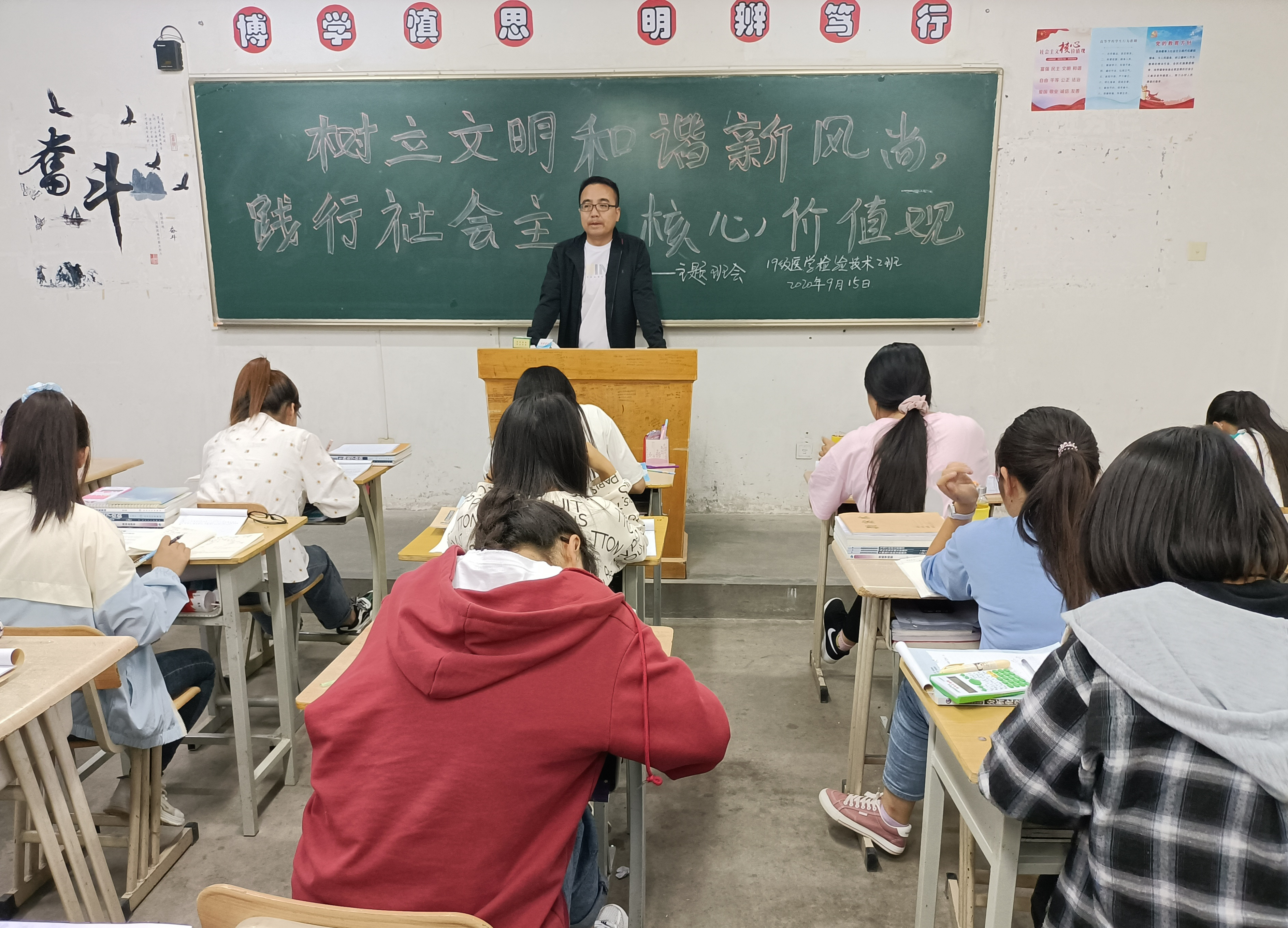 ?為深入學(xué)習(xí)習(xí)近平新時代中國特色社會主義思想和黨的十九大、十九屆四中全會精神,堅決落實學(xué)院關(guān)于文明校園和文明城市創(chuàng)建的各項安排部署,深入推進(jìn)制止餐飲浪費行為系列活動,團(tuán)結(jié)引領(lǐng)我系師生積極踐行社會主義核心價值觀,樹立文明和諧新風(fēng)尚。醫(yī)學(xué)技術(shù)與信息管理系各教學(xué)班于2020年9月15日開展了“樹立文明新風(fēng)尚,踐行社會主義核心價值觀”主題班會教育活動。