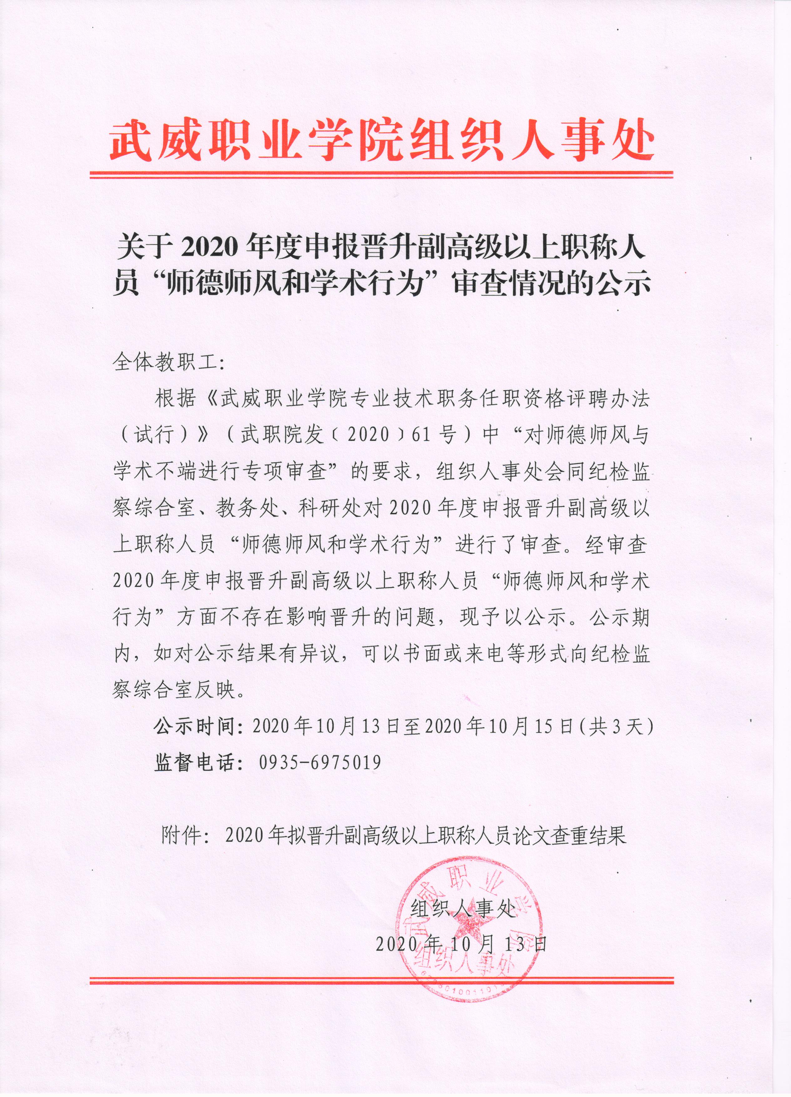 關(guān)于2020年度申報(bào)晉升副高級(jí)以上職稱人員“師德師風(fēng)和學(xué)術(shù)行為”審查情況的公示