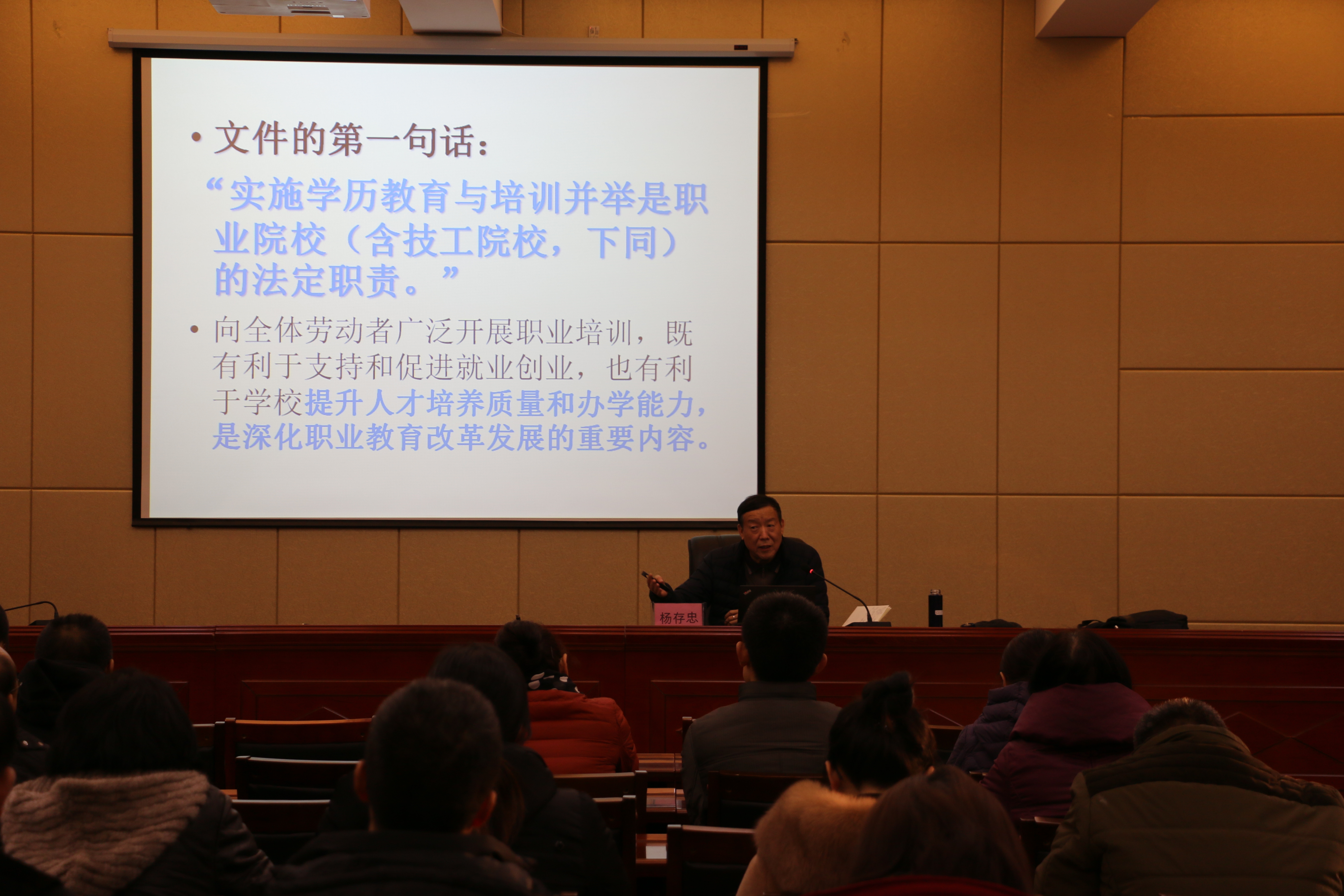 針對教育部11月25日發(fā)布的“關于做好《職業(yè)院校全面開展職業(yè)培訓 促進就業(yè)創(chuàng)業(yè)行動計劃》實施工作有關事項的通知”的文件(以下簡稱《行動計劃》),楊教授從《行動計劃》出臺的背景和意義、職業(yè)院校的法定職責、職業(yè)院校普遍存在的問題、《行動計劃》對職業(yè)院校提出的重點任務和行動措施以及如何推進貫徹落實《行動計劃》等五個方面和大家進行了學習分享。楊教授強調,深化職業(yè)教育改革發(fā)展,職業(yè)院校敞開校門,廣泛開展培訓工作,服務社會發(fā)展,是職業(yè)院校的法定責任,也是學院可持續(xù)發(fā)展和生存的必然趨勢。《行動計劃》對職業(yè)院校提出了十個方面的行動措施一是廣泛開展企業(yè)職工技能培訓。二是積極開展面向重點人群的就業(yè)創(chuàng)業(yè)培訓。三是大力開展失業(yè)人員再就業(yè)培訓。四是做好職業(yè)指導和就業(yè)服務。五是推進培訓資源建設和模式改革。六是加強培訓師資隊伍建設。七是支持多方合作共建培訓實訓基地。八是完善職業(yè)院校開展培訓的激勵政策。九是健全參訓人員的支持鼓勵政策。十是建立培訓評價與考核機制。楊教授希望大家能夠學好文件并認真思考學院的改革發(fā)展。把立德樹人、服務發(fā)展、促進就業(yè)、適應需求的辦學理念傳承下去。