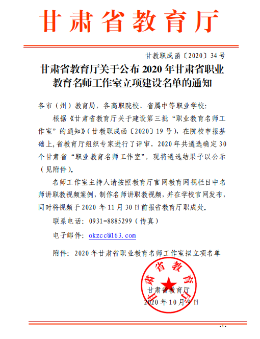 甘肅省教育廳關(guān)于公布 2020 年甘肅省職業(yè) 教育名師工作室立項建設(shè)名單的通知