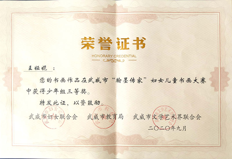 人文藝術(shù)教育系學(xué)生參加武威市“翰墨傳家”婦女兒童書畫大賽獲獎(jiǎng)