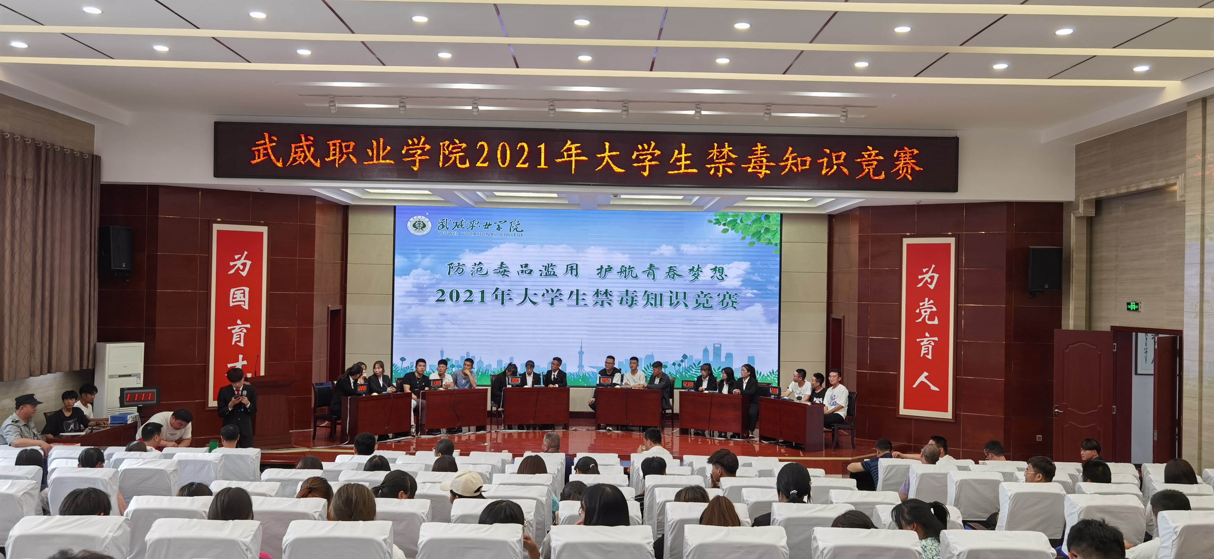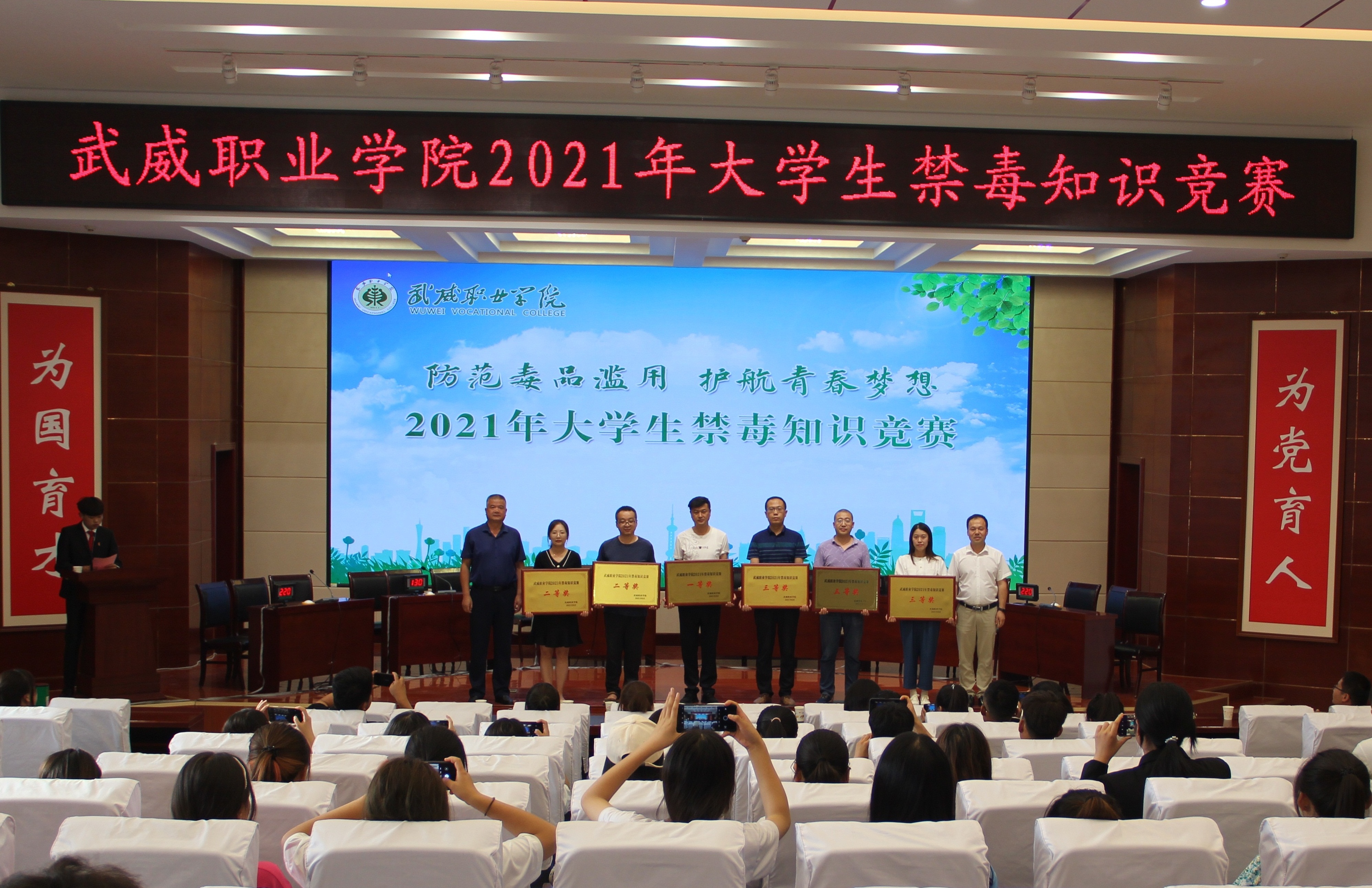 為加強在校大學(xué)生禁毒知識普及教育,深入推進青少年毒品預(yù)防教育“6.27”工程,7月5日下午,學(xué)院在菁英廳舉辦以“防范毒品濫用,護航青春夢想”為主題的2021年大學(xué)生禁毒知識競賽決賽。學(xué)院黨委委員、副院長王守云出席活動。各教學(xué)院系200多名師生觀看了比賽。