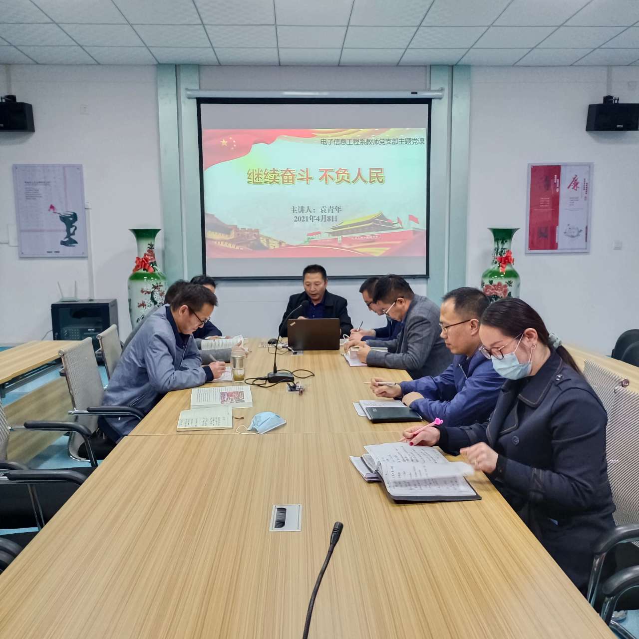 4月8日,電子信息工程系黨總支開(kāi)展黨總支書(shū)記講黨課活動(dòng),全體教師黨員參加了學(xué)習(xí)。電子信息工程系黨總支書(shū)記袁青年同志以“繼續(xù)奮斗、不負(fù)人民”主題講了黨課。