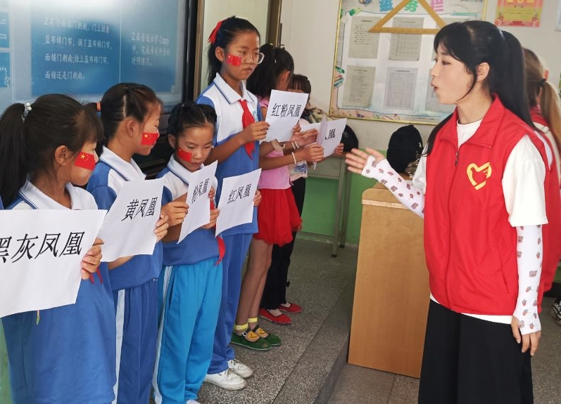 圖為實(shí)踐隊(duì)員正在和孩子們玩繞口令游戲