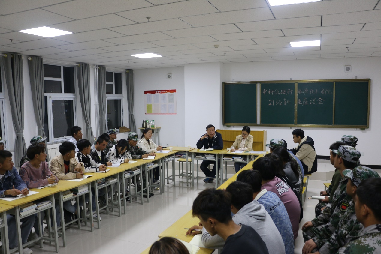 座談會上,楊存忠教授、米麗娟博士對新同學的到來表示熱烈歡迎,就同學們的軍訓情況、學習生活情況進行了解。在互動交流環(huán)節(jié),對同學們存在的疑問,從所學專業(yè)與國家雙碳戰(zhàn)略聯(lián)系的角度就專業(yè)開設淵源、個人發(fā)展規(guī)劃、知識技能儲備、就業(yè)方向前景等方面進行答疑解惑、分析指導。