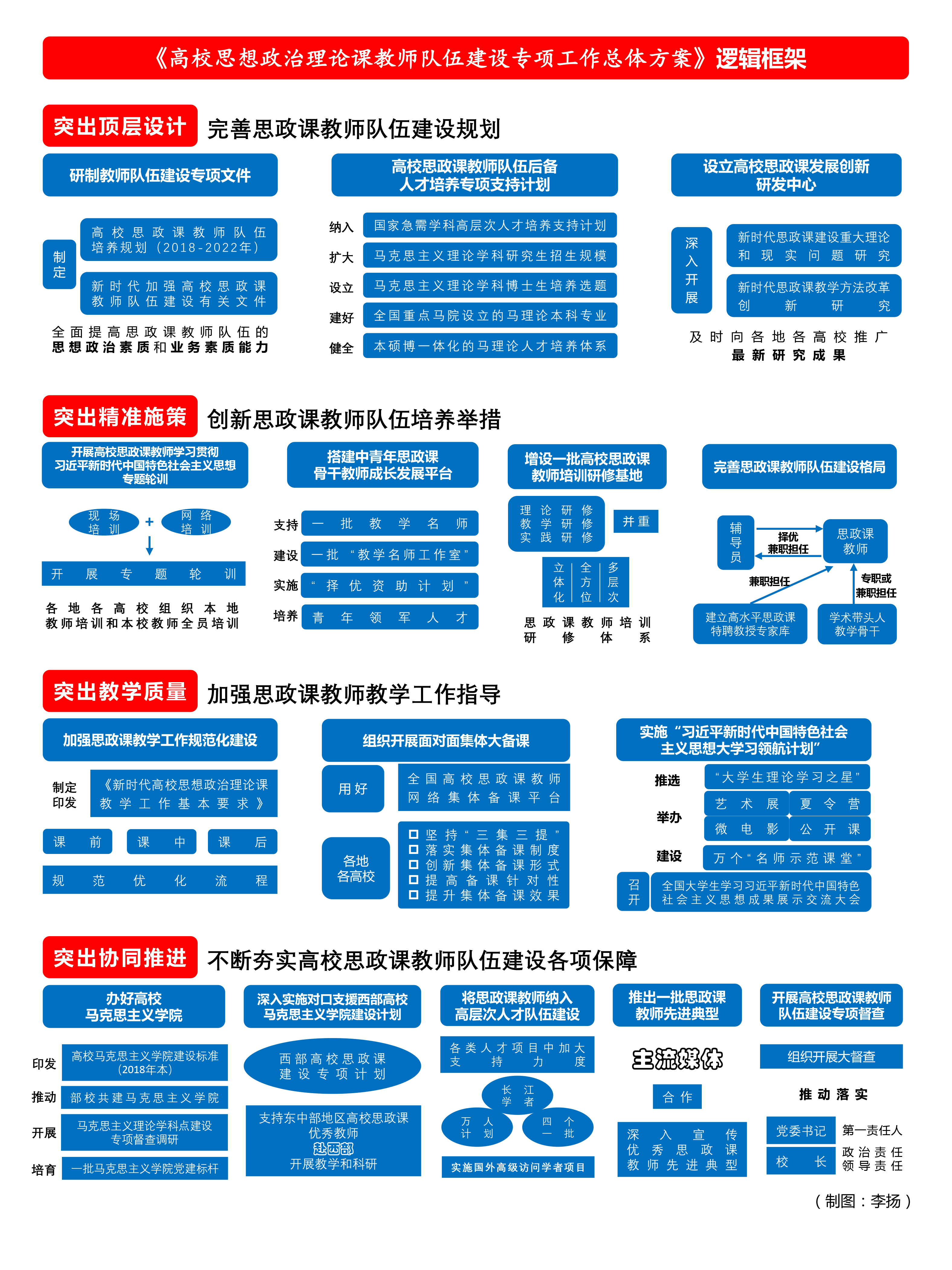 《方案》要求突出協(xié)同推進(jìn),不斷夯實(shí)高校思政課教師隊(duì)伍建設(shè)各項(xiàng)保障。深入推動(dòng)部校共建馬克思主義學(xué)院,培育一批高校馬克思主義學(xué)院黨建標(biāo)桿、思政課教師先進(jìn)黨支部,實(shí)施對口支援西部高校馬克思主義學(xué)院建設(shè)計(jì)劃,支持西部12省(區(qū)、市)和新疆生產(chǎn)建設(shè)兵團(tuán)思政課建設(shè),在“長江學(xué)者獎(jiǎng)勵(lì)計(jì)劃”“萬人計(jì)劃”“四個(gè)一批”人才等項(xiàng)目中加大對高校思政課教師隊(duì)伍的支持力度,深入宣傳優(yōu)秀思政課教師先進(jìn)典型,開展高校思政課教師隊(duì)伍建設(shè)專項(xiàng)督查,切實(shí)把思政課教師隊(duì)伍建設(shè)的各項(xiàng)要求落到實(shí)處。