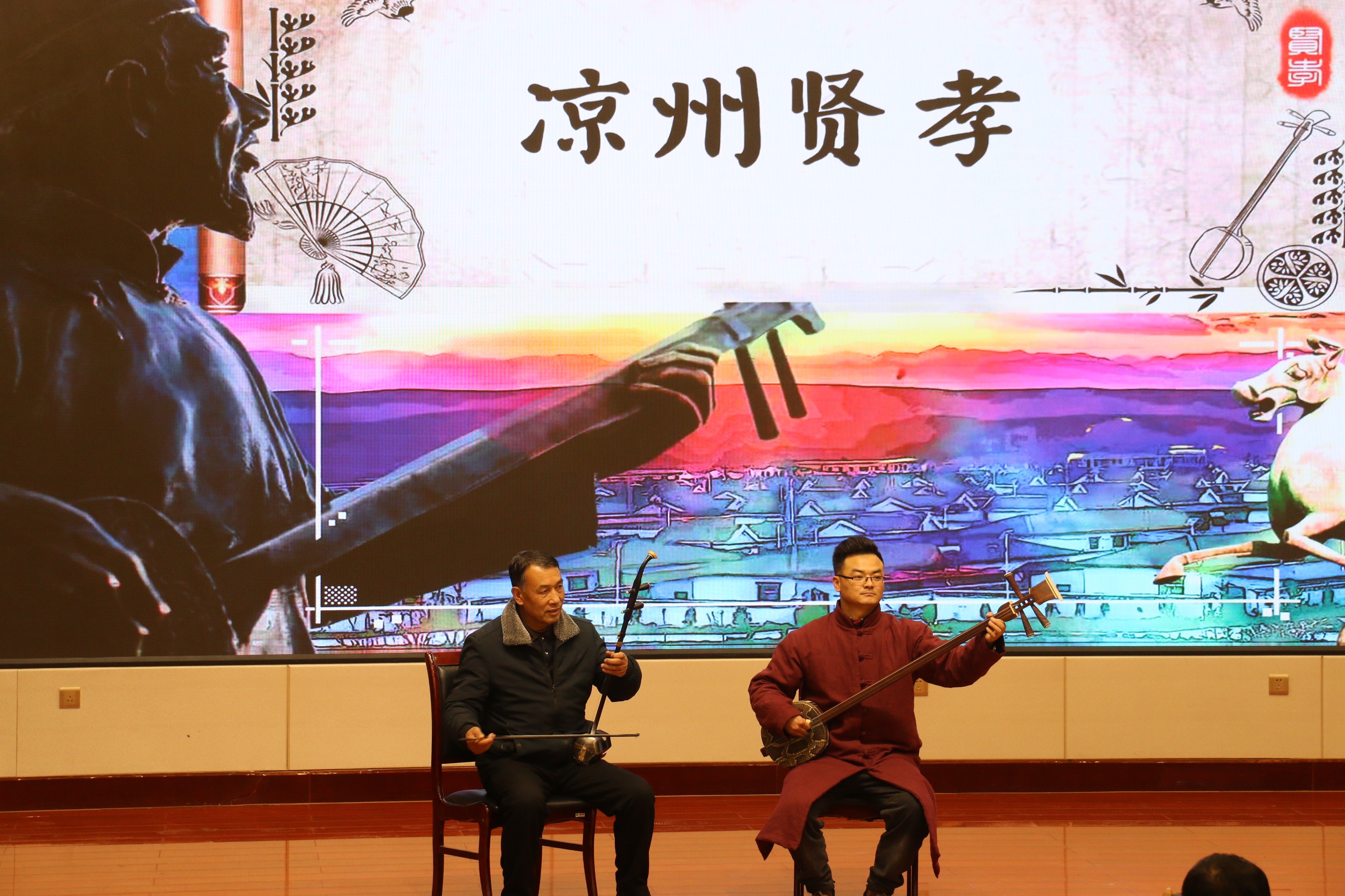 隨后,賈旭峰圍繞涼州賢孝的起源、分類、使用的樂器、唱法、創(chuàng)新傳承與現(xiàn)代價(jià)值等做了專題報(bào)告。涼州賢孝又稱“涼州勸善書”或“瞎賢”,內(nèi)容以說唱英雄賢士、忠臣良將、孝子賢女等故事,教化人們“處事為賢,居家盡孝”。涼州賢孝唱本分國書和家書,“家書”取材于家庭生活的方方面面,“國書”主要歌頌安邦定國的忠臣良將的高尚品德與智慧,勸導(dǎo)為人要賢,為子要孝,注重行為,貢獻(xiàn)社會(huì)。