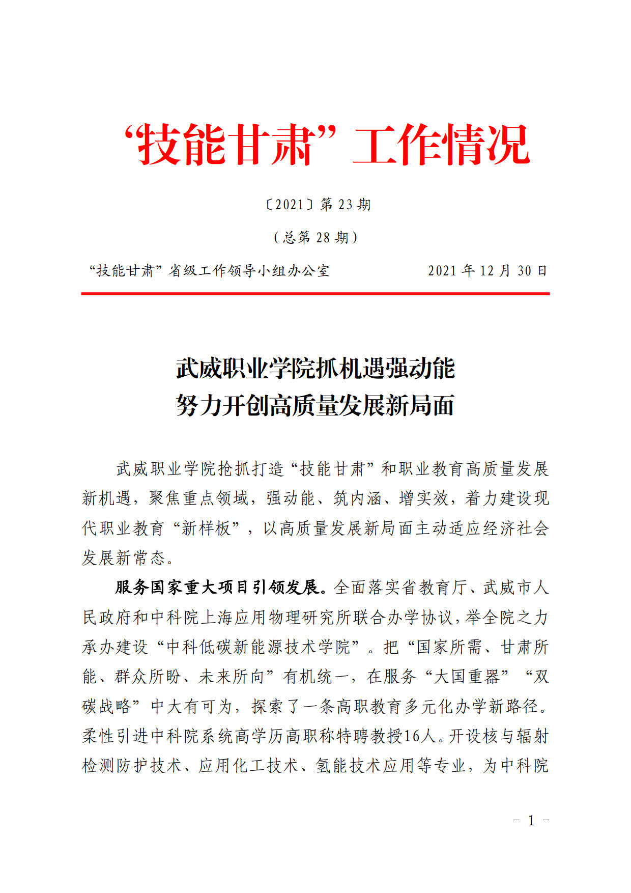 技能甘肅工作情況第28期:武威職業(yè)學(xué)院抓機遇強動能努力實現(xiàn)高質(zhì)量發(fā)展