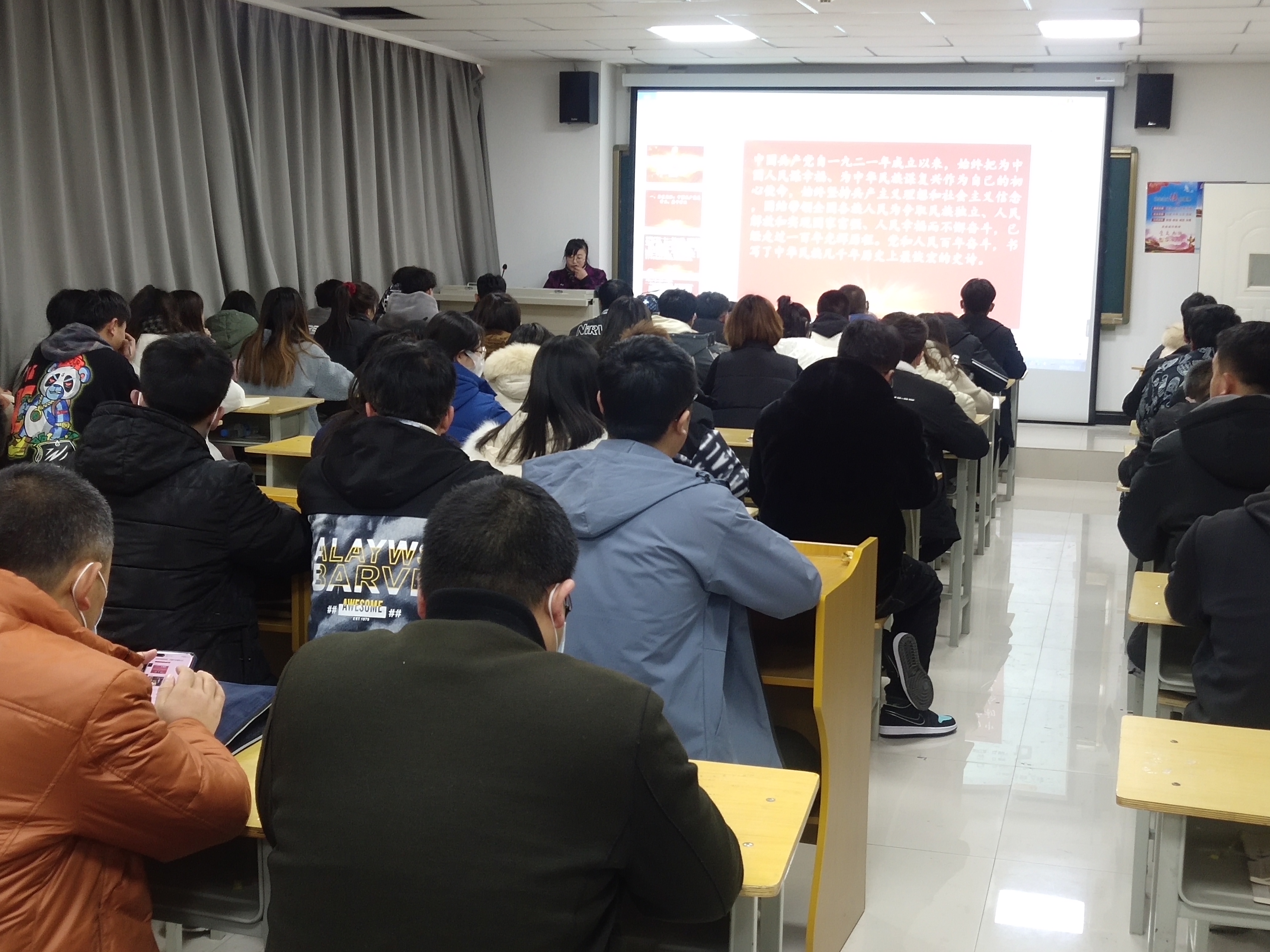 王靜老師緊緊圍繞學習貫徹黨的十九屆六中全會精神,聯(lián)系歷史、現(xiàn)實和未來,從黨的十九屆六中全會的總體概況、精髓要義、重大意義三個方面進行宣講,全面、準確、深入地闡釋了中國共產黨的百年奮斗成就和歷史經驗。與會師生紛紛表示,要深入學習黨的十九屆六中全會精神,做到學深悟透,確保把黨的十九屆六中全會精神把握準、理解透、落實好,把深入學習黨的十九屆六中全會精神同推動工作、學習結合起來,更加奮發(fā)有為地做好各項工作。