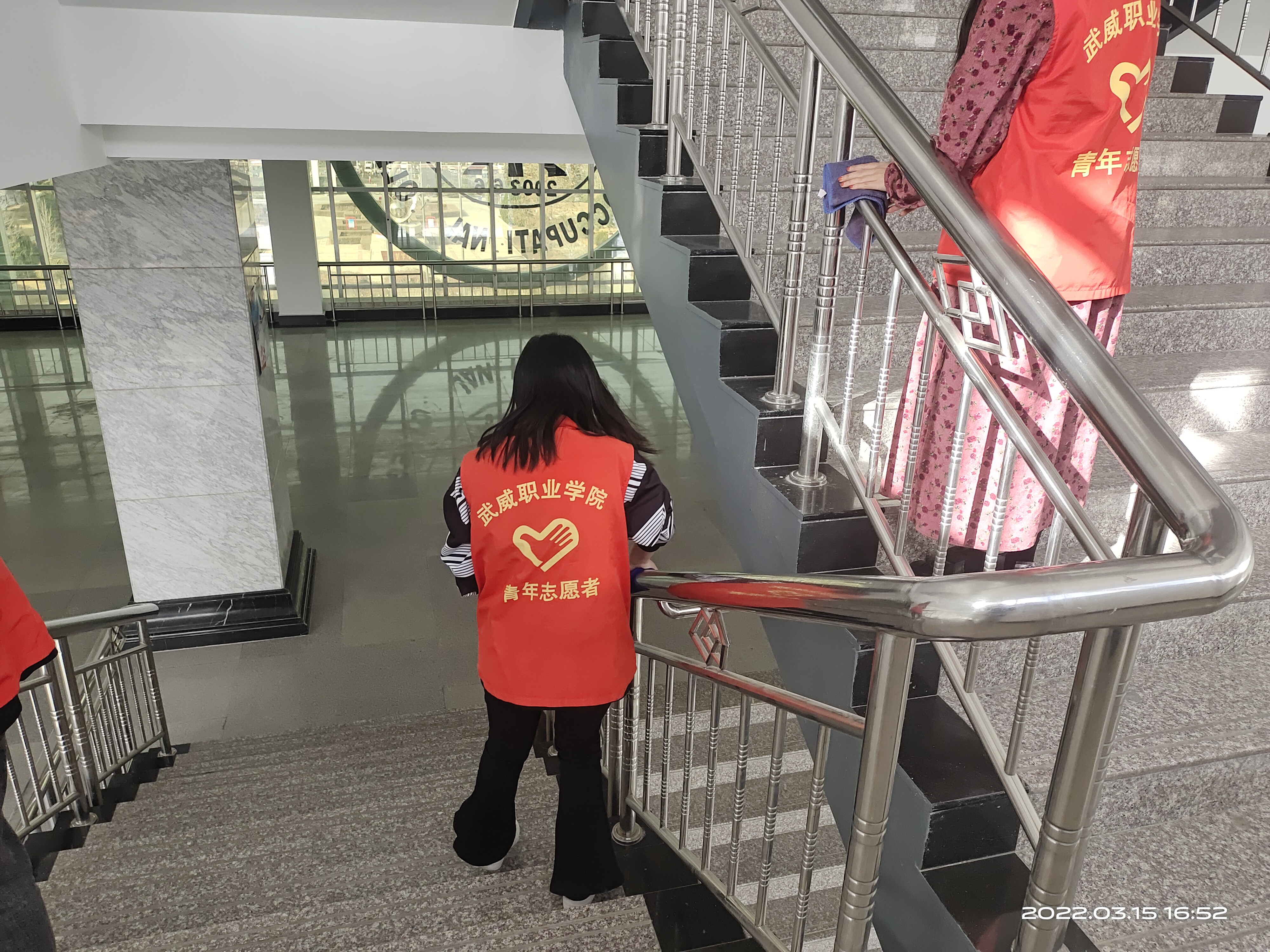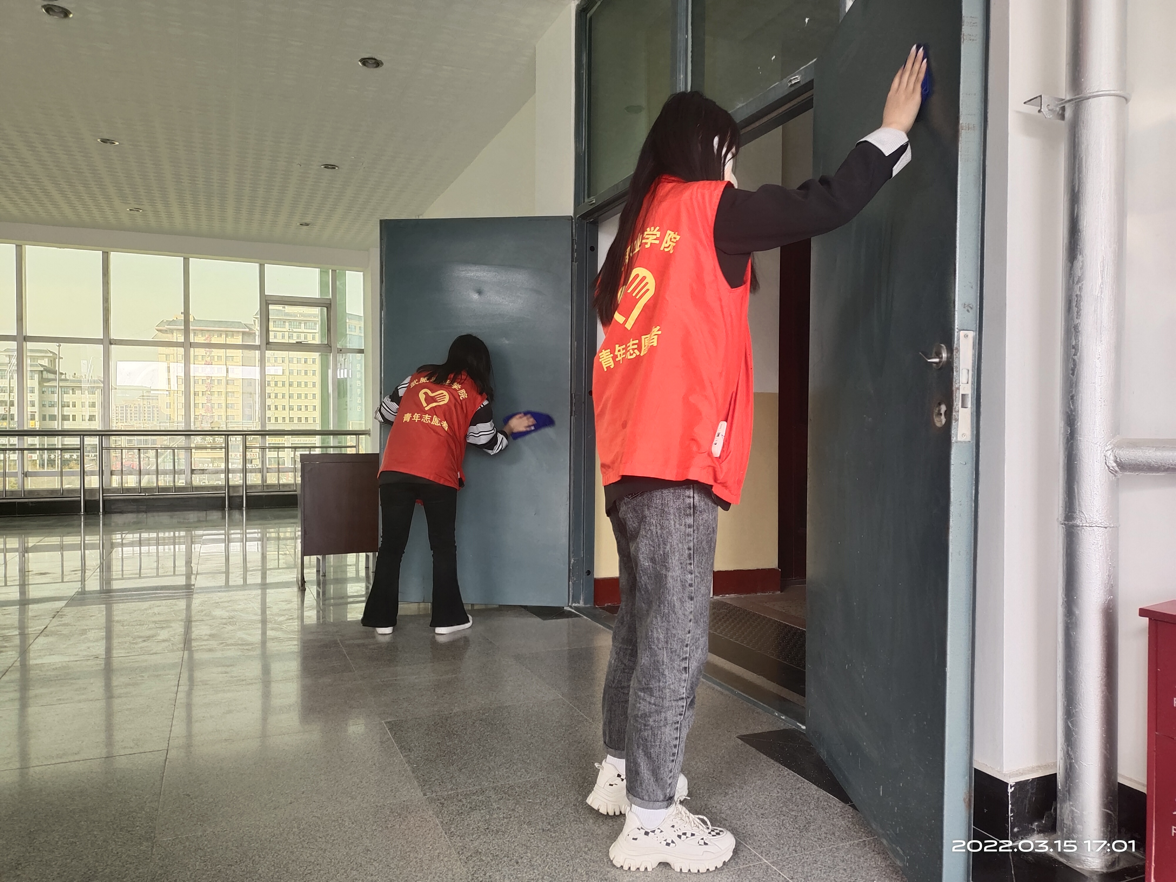 青年志愿者們不僅僅只是一個(gè)名義,他們不怕臟,不怕累,穿梭在校園各個(gè)角落,他們拿著掃帚、簸箕打掃衛(wèi)生死角,撿煙頭,還有一批在教學(xué)樓內(nèi)打掃公共教室的,有的在收拾垃圾,有的在擦黑板。教學(xué)樓門(mén)口也有他們的身影,在烈日炎炎下擦拭著玻璃,他們這種勇于參與志愿者活動(dòng)、不怕苦、不怕累的精神值得同學(xué)們學(xué)習(xí)。