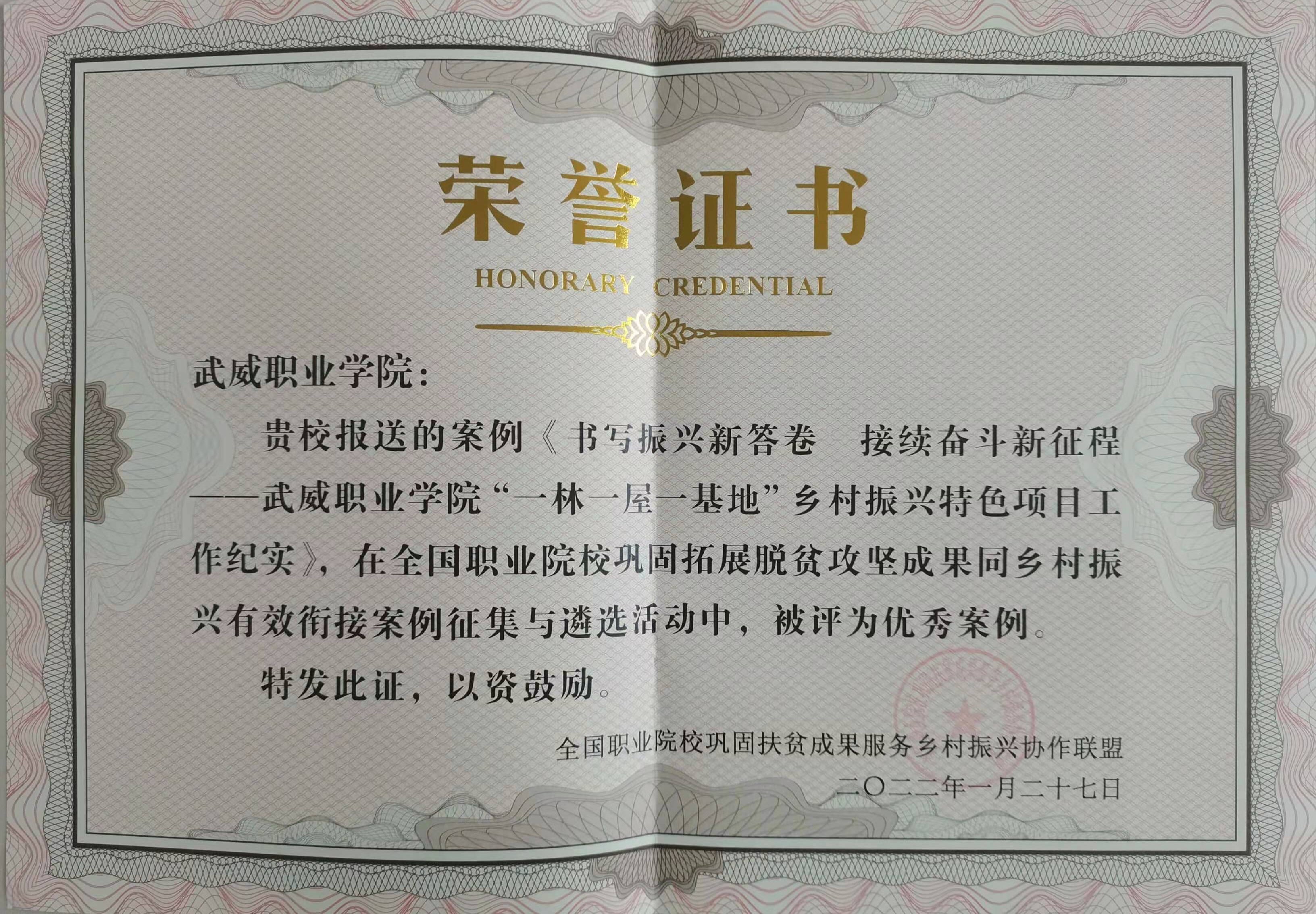 近日,學(xué)院鄉(xiāng)村振興成果《書(shū)寫(xiě)振興新答卷 接續(xù)奮斗新征程——武威職業(yè)學(xué)院“一林一屋一基地”鄉(xiāng)村振興特色項(xiàng)目工作紀(jì)實(shí)》被全國(guó)職業(yè)院校鞏固扶貧成果服務(wù)鄉(xiāng)村振興協(xié)作聯(lián)盟評(píng)為優(yōu)秀案例。