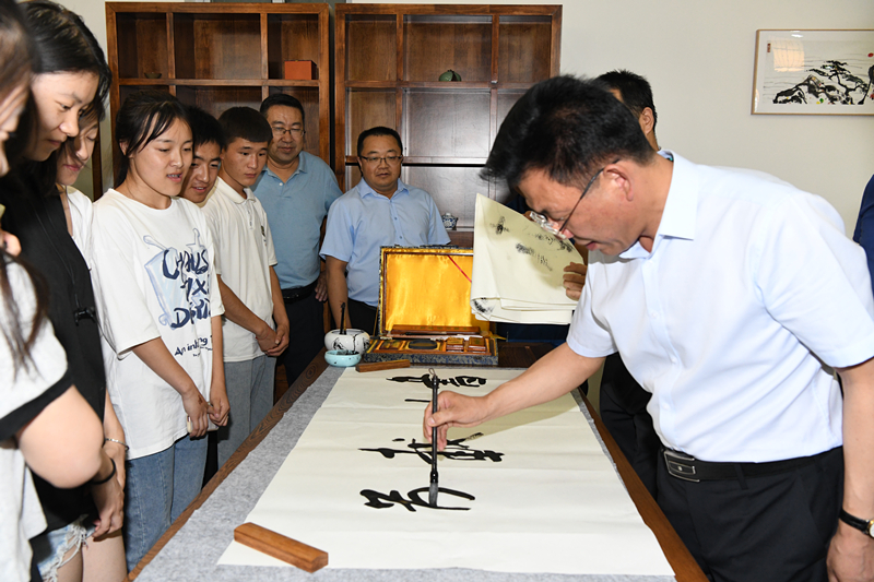 趙明在致辭中向市文旅局、市書畫院及齊澤山先生長期以來對學(xué)校改革發(fā)展給予的關(guān)心和支持表示衷心的感謝。他表示,齊澤山先生為學(xué)校捐贈的書法作品為整個校園人文景觀和文化環(huán)境增添了濃墨重彩的一筆,促進(jìn)了樓宇文化建設(shè)。學(xué)校將珍惜并運用好這些優(yōu)質(zhì)文化資源,發(fā)揮好藝術(shù)作品的審美功能、教育功能,用藝術(shù)熏陶和精神洗禮進(jìn)一步激勵廣大師生。