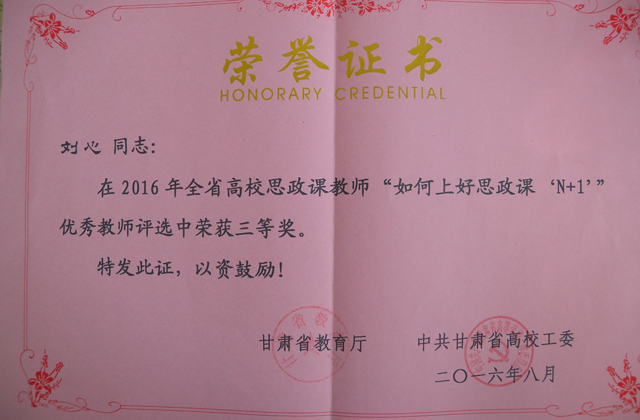 根據(jù)《甘肅省教育廳 中共甘肅省高校工委關(guān)于開展“如何上好思政課‘N+1’”優(yōu)秀教師評(píng)選活動(dòng)的通知》要求,我系劉心教師積極參加,最終喜獲由甘肅省教育廳 中共甘肅省高校工委頒發(fā)的在2016年全省高校思政課教師“如何上好思政課‘N+1’”優(yōu)秀教師評(píng)選中榮獲三等獎(jiǎng)。