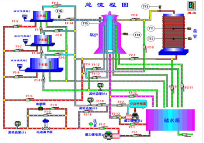 高級(jí)過(guò)程控制系統(tǒng)主要特點(diǎn)是被調(diào)參數(shù)囊括了流量、壓力、液位、溫度四大熱工參數(shù);執(zhí)行器中既有電動(dòng)調(diào)節(jié)閥儀表類(lèi)執(zhí)行機(jī)構(gòu),又有變頻器等電力拖動(dòng)類(lèi)執(zhí)行器。系統(tǒng)除了能改變調(diào)節(jié)器的設(shè)定值作階躍擾動(dòng)外,還可在對(duì)象中通過(guò)電磁閥和手操作閥制造各種擾動(dòng)。一個(gè)被調(diào)參數(shù)可用不同的動(dòng)力源、不同的執(zhí)行器和不同的工藝線路下可演變成多種調(diào)節(jié)回路,以利于討論、比較各種調(diào)節(jié)方案的優(yōu)劣,從而進(jìn)行多變量控制系統(tǒng)及特定的高級(jí)過(guò)程控制系統(tǒng)實(shí)驗(yàn)。
