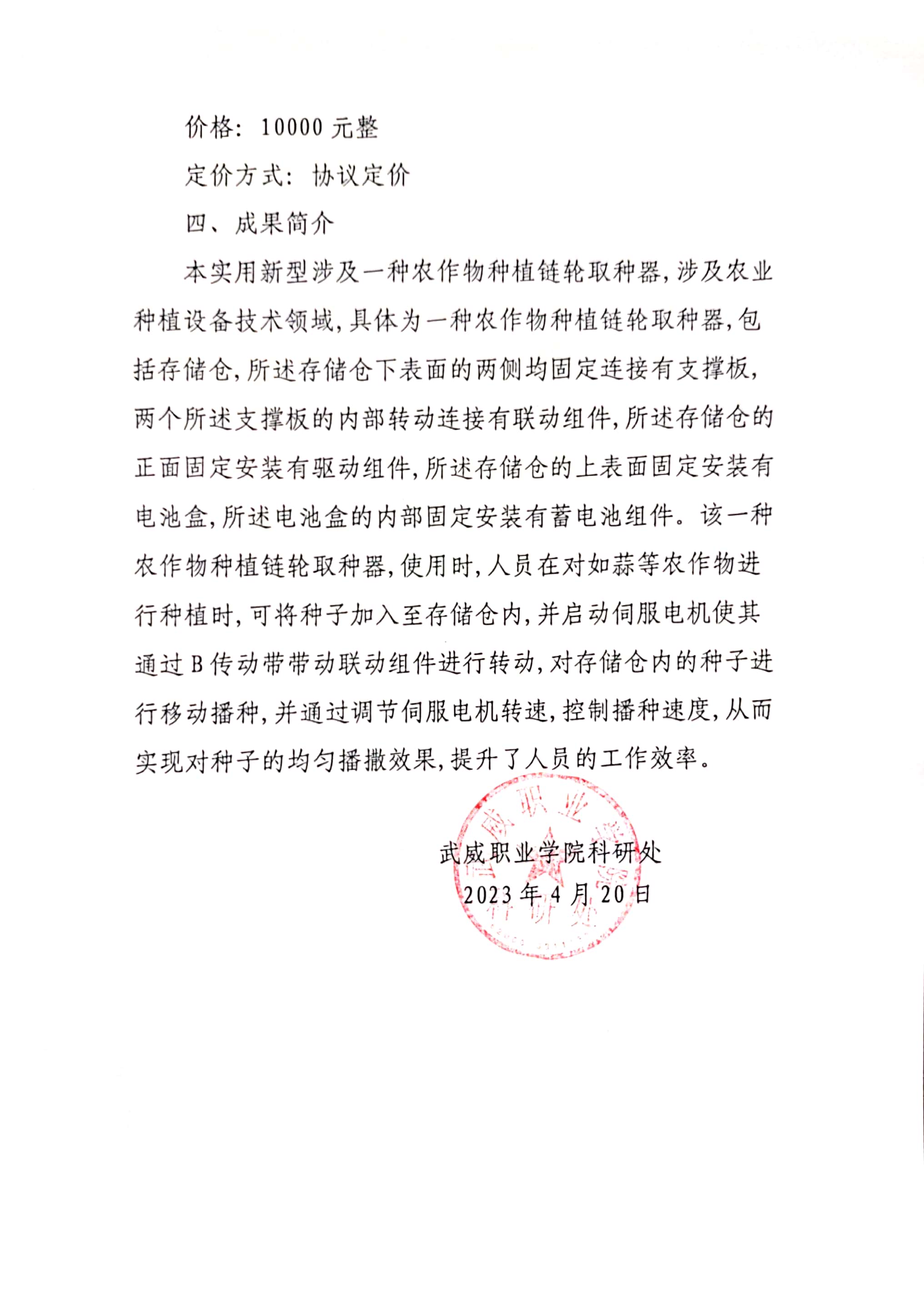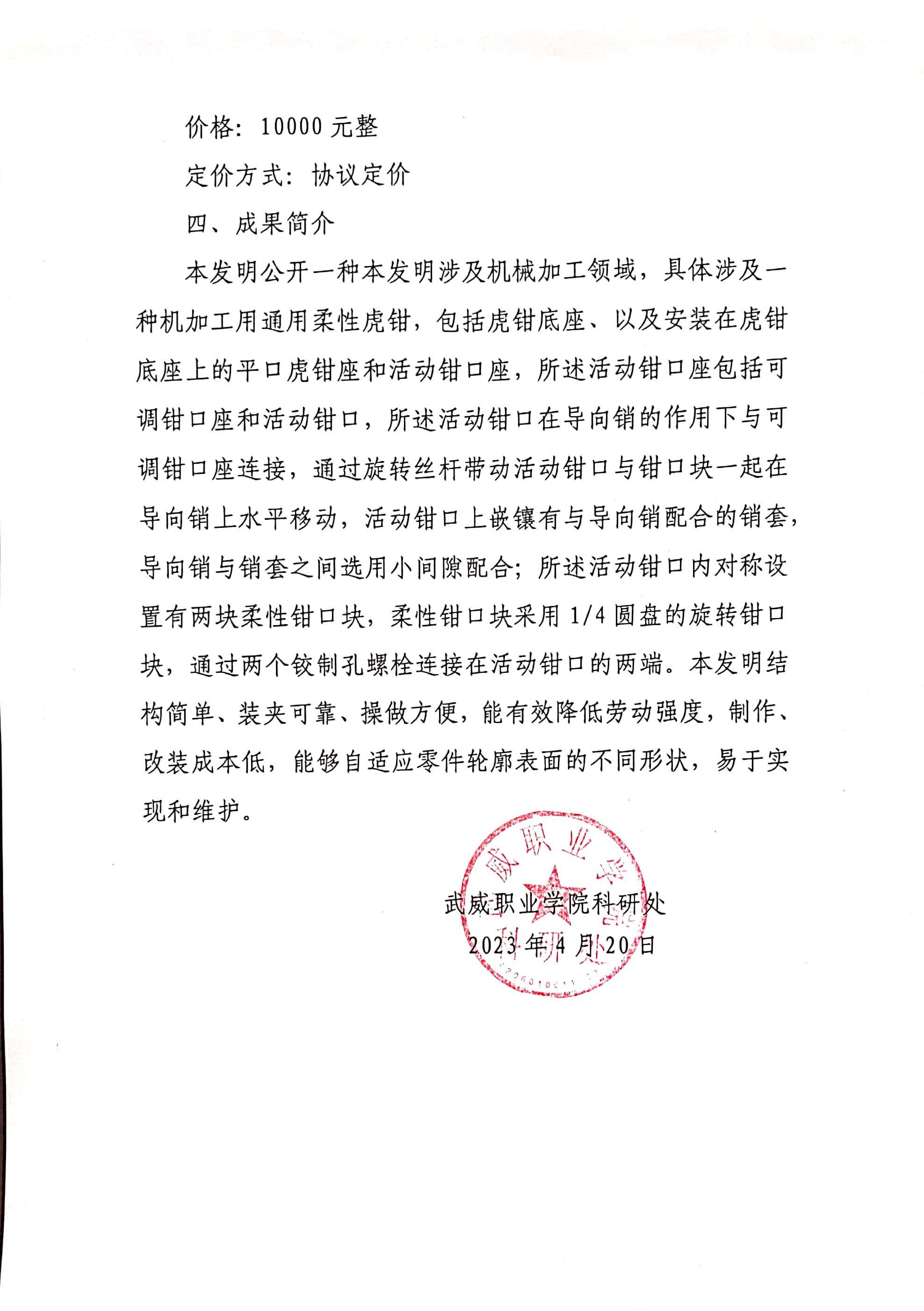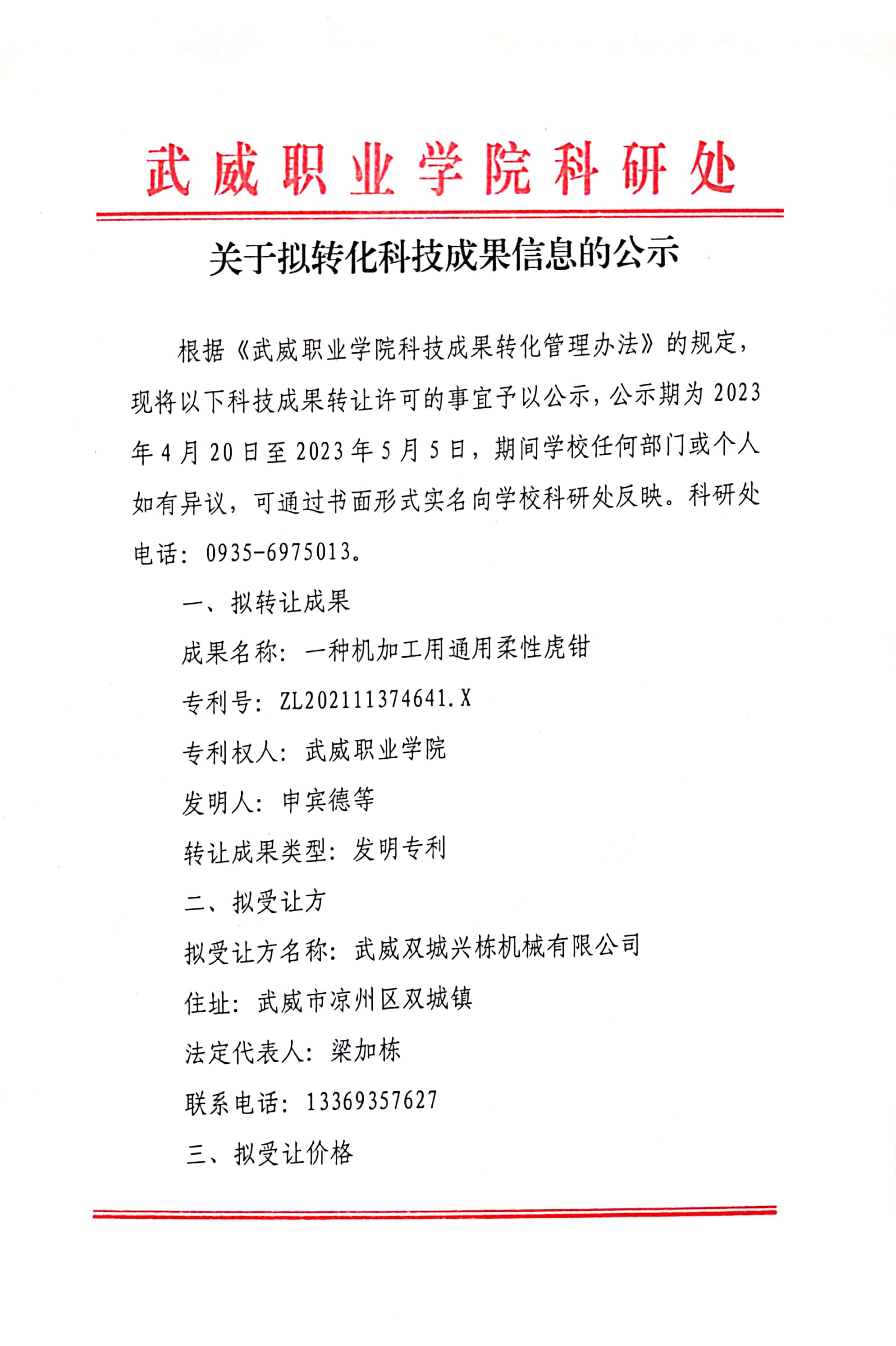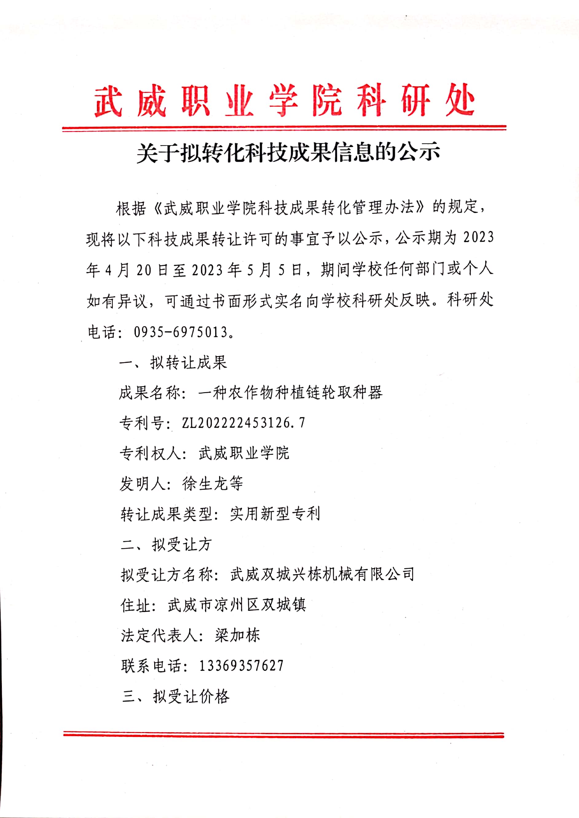 關(guān)于武威職業(yè)學(xué)院待轉(zhuǎn)化科技成果的公示