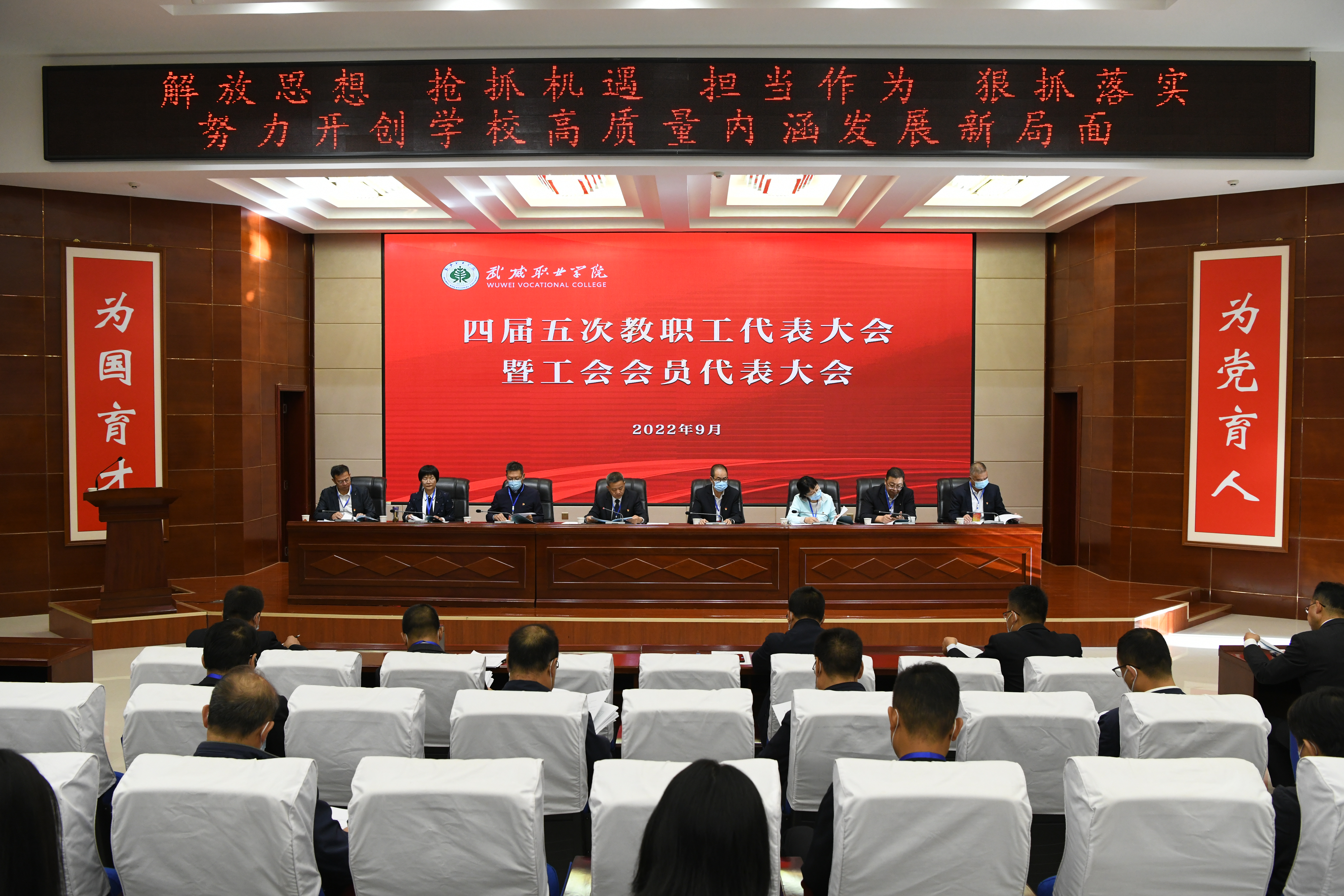 大會在雄壯的國歌聲中開幕,黨委書記、校長趙明作了題為《解放思想 搶抓機遇 擔當作為 狠抓落實 努力開創(chuàng)學校高質(zhì)量發(fā)展新局面》的工作報告,系統(tǒng)回顧了四屆四次教職工(會員)代表大會以來學校事業(yè)發(fā)展所取得的顯著成績,分析了學校當前面臨的形勢與存在的問題,明確了今后工作思路和主要工作舉措。副校長張開禮作了關于修訂《武威職業(yè)學院章程》的情況說明。大會以書面形式審議了《學校財務工作報告》《工會工作報告》《工會經(jīng)費審查報告》。