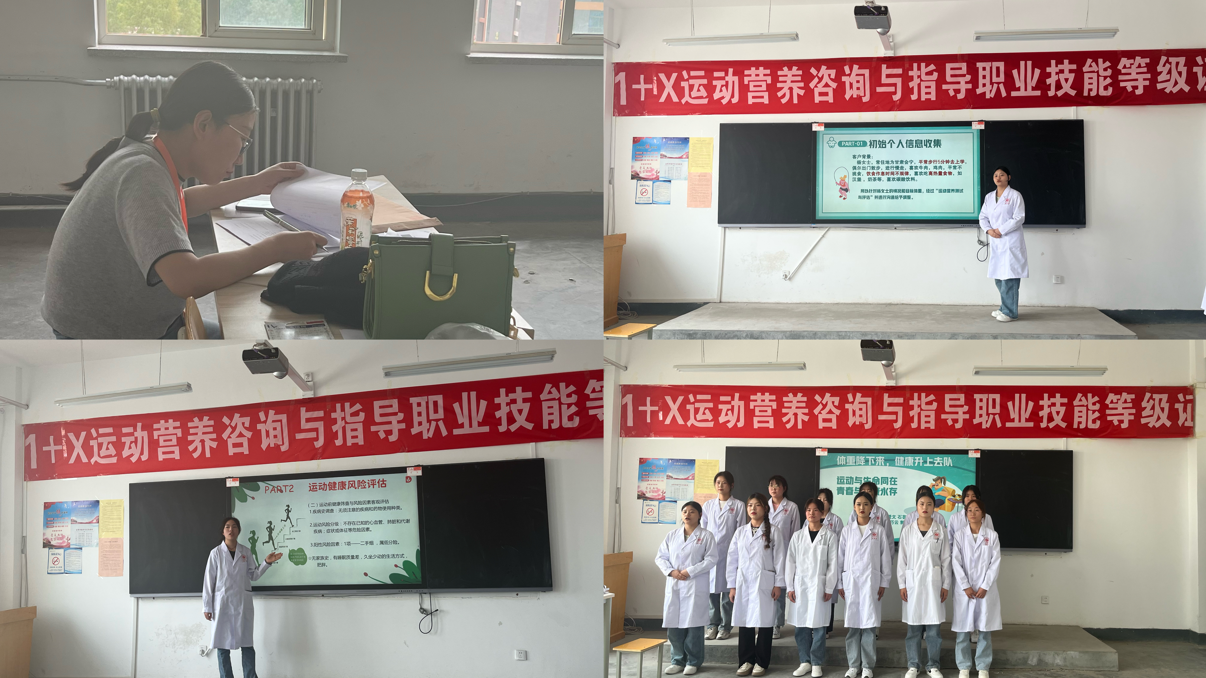 考試分為理論和實操兩部分。理論考試內(nèi)容依托《運動營養(yǎng)學》課程,涵蓋了運動風險評估、膳食調(diào)查、運動營養(yǎng)品的補充等多個領域知識;實操演練環(huán)節(jié)考核了運動營養(yǎng)方案的匯報和技能展示,全面檢驗了學生在運動營養(yǎng)方面的理論和實踐水平。