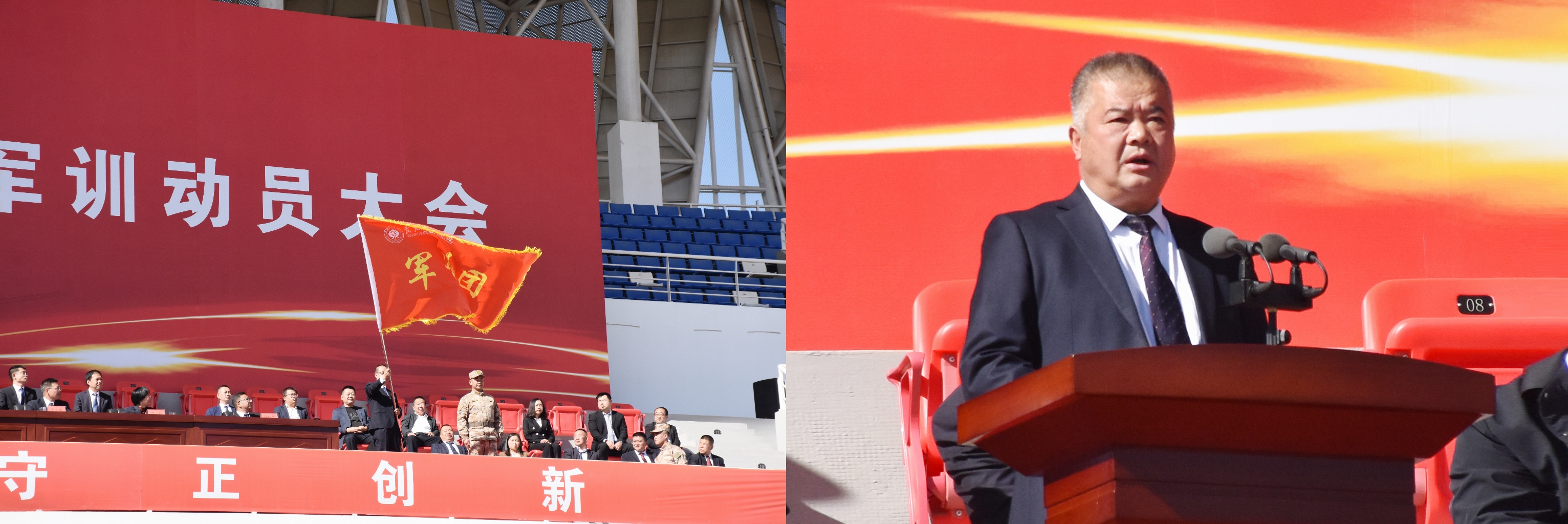 軍訓動員階段,黨委委員,副校長王守云安排了2023級新生軍訓工作,軍訓教官李昌泰作發(fā)言,黨委副書記翟存祥向軍訓團授旗。