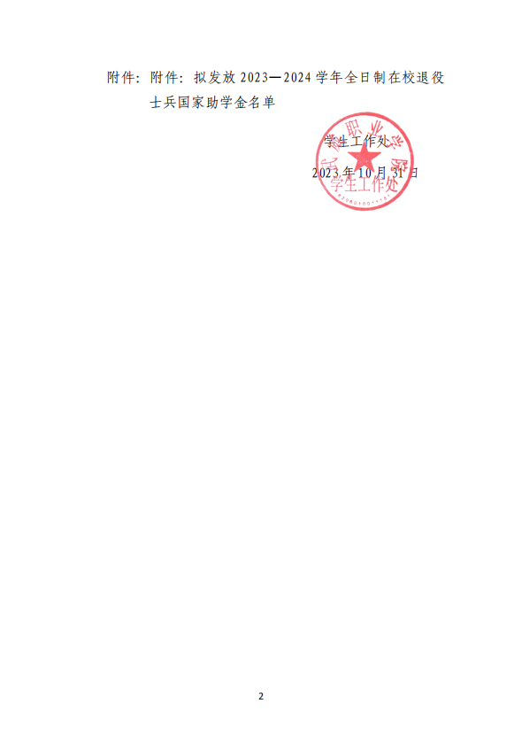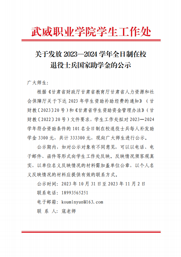關(guān)于擬發(fā)放2023—2024學年全日制在校退役士兵國家助學金的公示