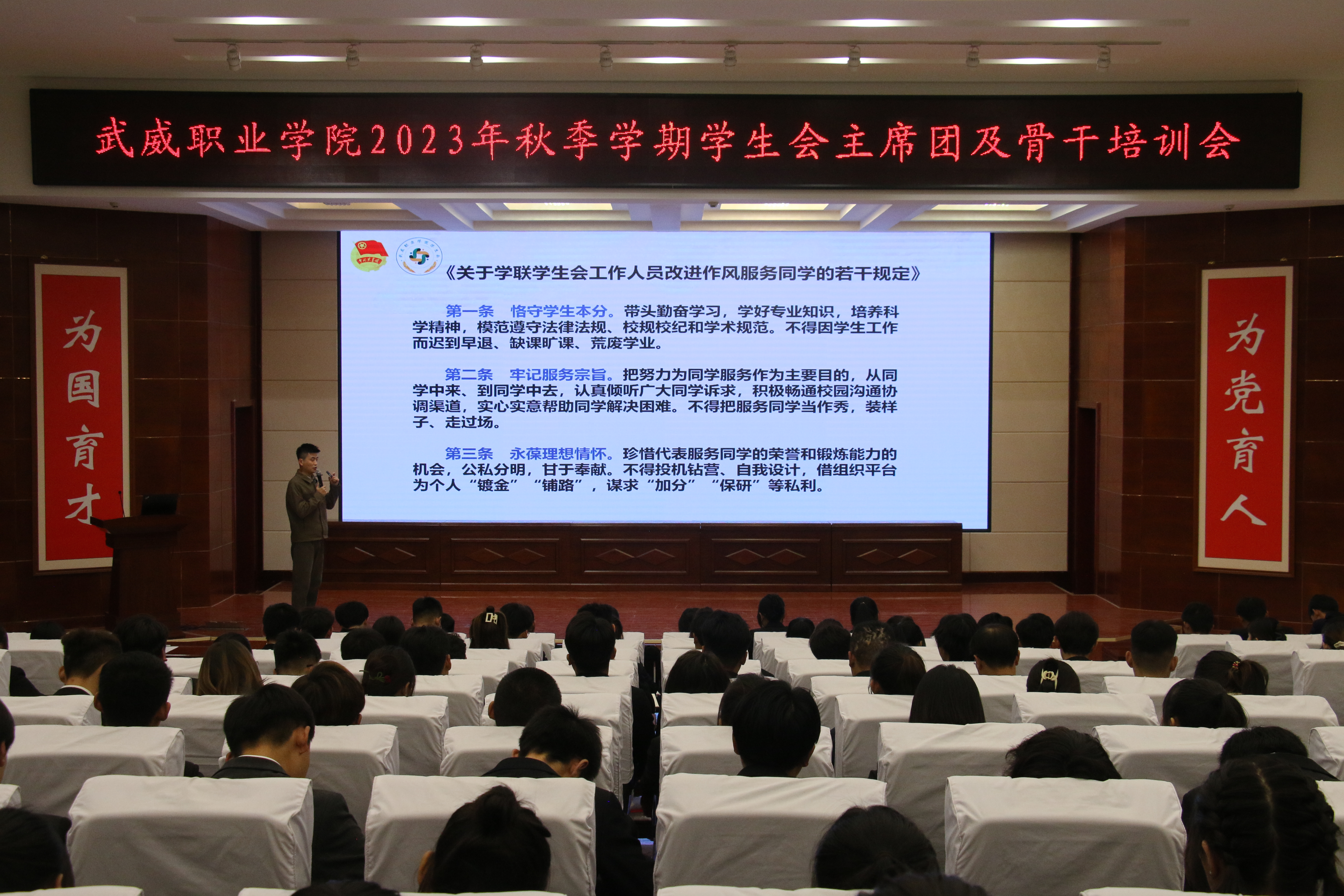 校學(xué)生會主席團(tuán)成員帶頭領(lǐng)學(xué)了《關(guān)于學(xué)聯(lián)學(xué)生會工作人員改進(jìn)作風(fēng)服務(wù)同學(xué)的若干規(guī)定》《武威職業(yè)學(xué)院學(xué)生會章程》等制度文件。學(xué)生會秘書長張登海以《微光凝聚星海,筑夢情懷方舟》為題,圍繞加強(qiáng)思想政治建設(shè)、深化學(xué)生會組織改革和進(jìn)一步加強(qiáng)從嚴(yán)治會等方面,為學(xué)生會組織成員展開培訓(xùn)。
