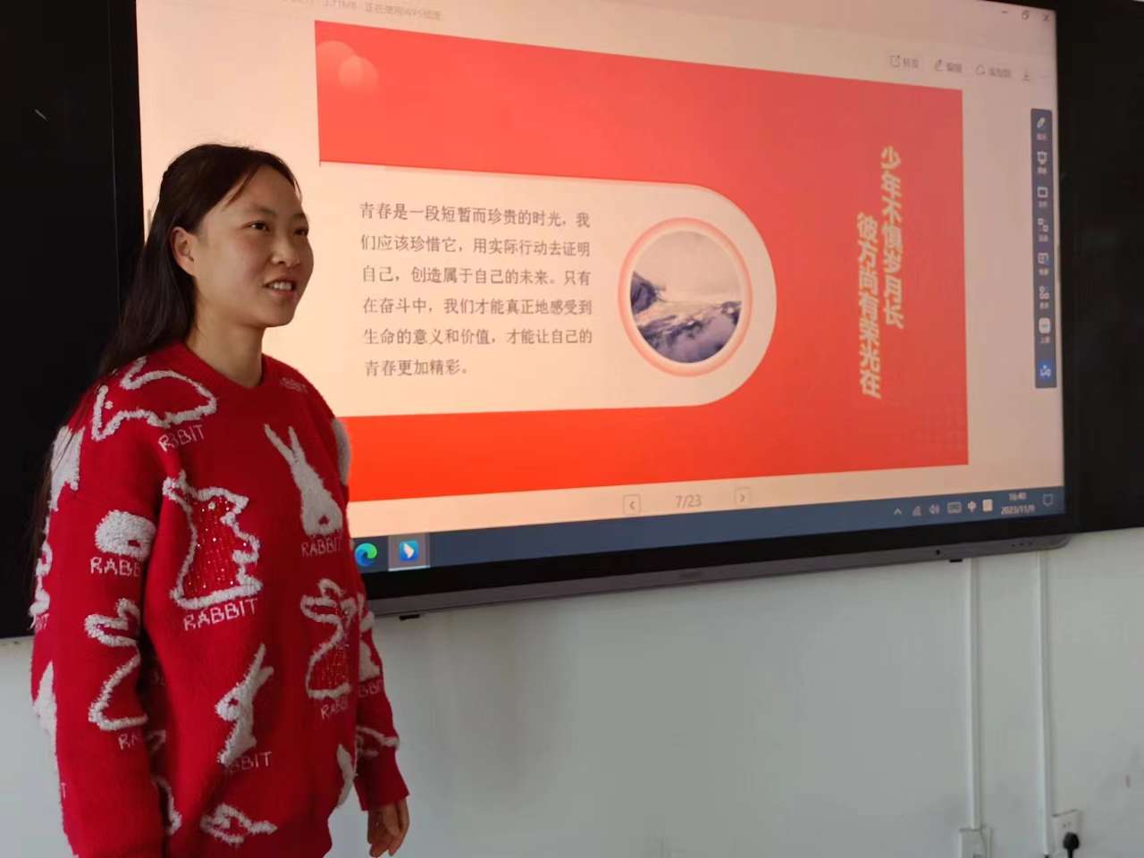 藝術(shù)與教育學(xué)院2021級(jí)學(xué)生后麗婷分享了自己參加“三下鄉(xiāng)”社會(huì)實(shí)踐服務(wù)團(tuán)隊(duì),走進(jìn)基層社區(qū)開(kāi)展志愿服務(wù)活動(dòng),在基層體悟中不斷增強(qiáng)責(zé)任感和使命感,在社會(huì)課堂中“受教育、長(zhǎng)才干、作貢獻(xiàn)”的事跡。她期盼各位學(xué)子做新時(shí)代好青年,如螢火一般,有一分熱便發(fā)一分光,以?shī)^斗來(lái)點(diǎn)亮青春最亮麗的底色。