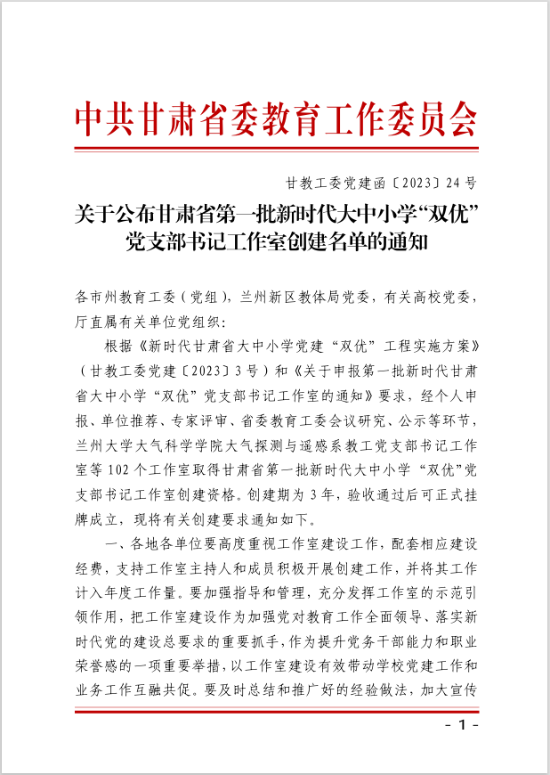 近日,中共甘肅省委教育工作委員會公布了《關于公布甘肅省第一批新時代大中小學“雙優(yōu)”黨支部書記工作室創(chuàng)建名單的通知》(甘教工委黨建函〔2023〕24號),全省高校32個黨支部書記工作室獲批創(chuàng)建資格,中科低碳新能源技術學院教師黨支部書記工作室(支部書記黃述杰教授)成功入選,獲得創(chuàng)建資格。